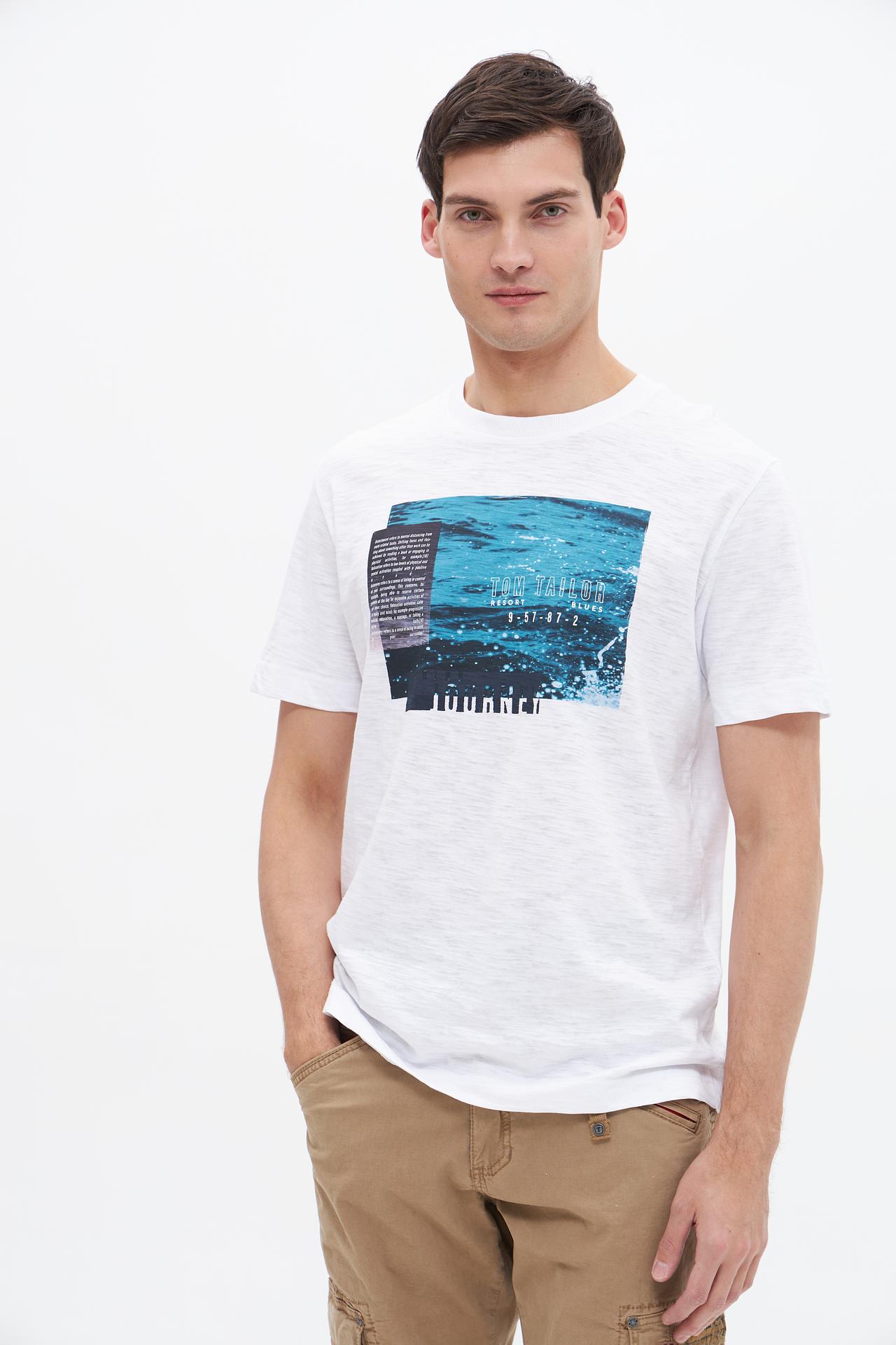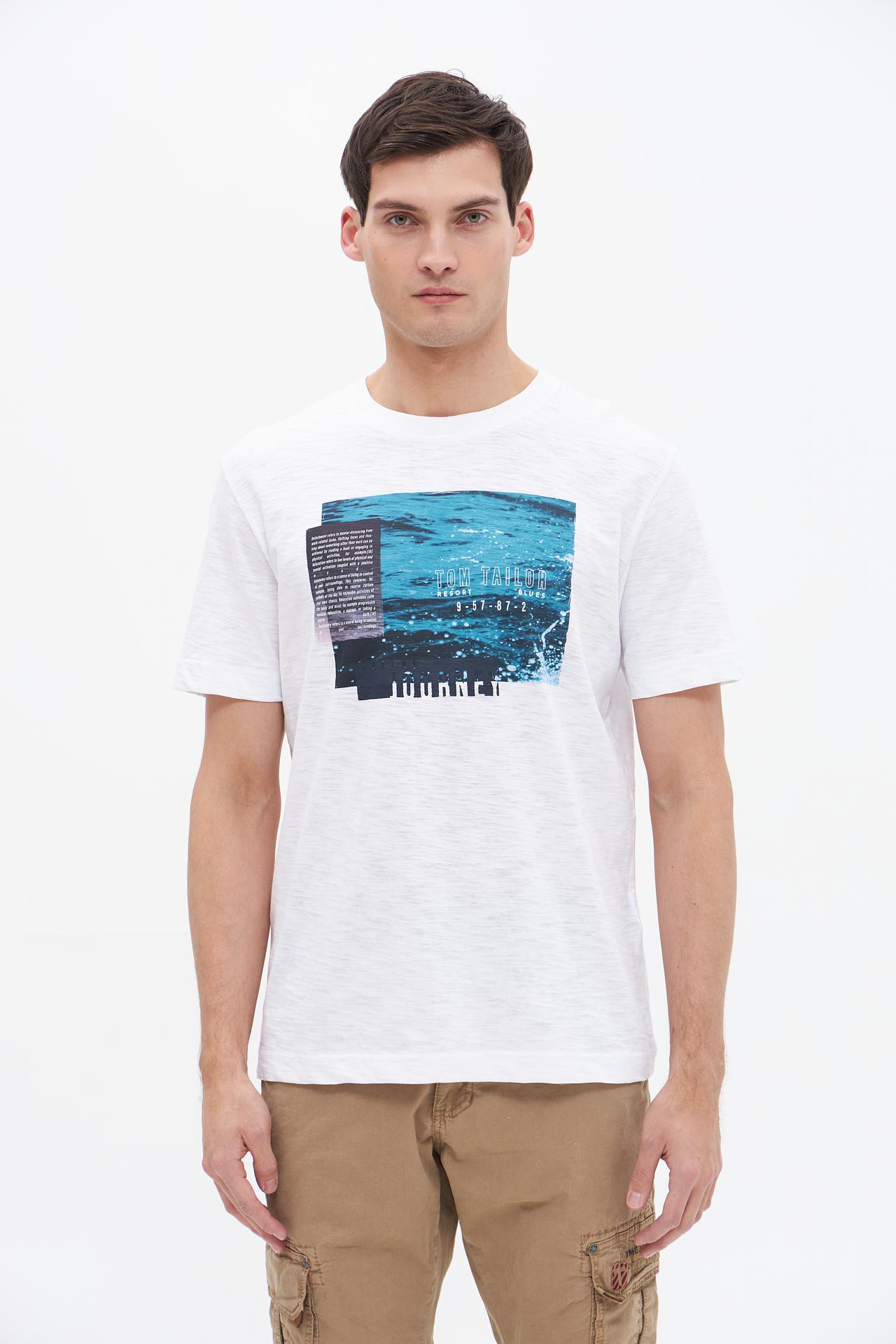 Футболка с круглым вырезом и короткими рукавами дополнена ярким графическим принтом на груди, который добавляет индивидуальности. Принт с элементами воды и надписями Tom Tailor создает динамичный акцент, делая футболку заметной частью гардероба. Она идеально подходит для летнего сезона и теплой погоды.