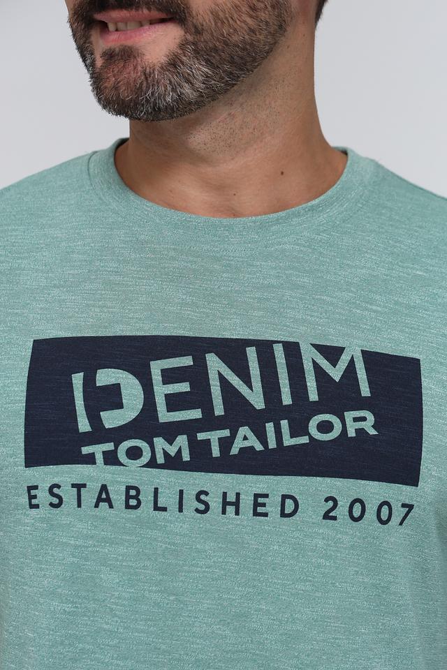 Основным элементом дизайна является крупный логотип "DENIM Tom Tailor ESTABLISHED 2007", выполненный в тёмно-синем цвете с белой окантовкой. Принт придает футболке современный и узнаваемый вид.