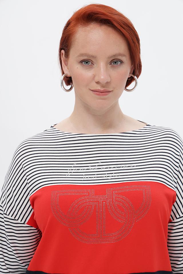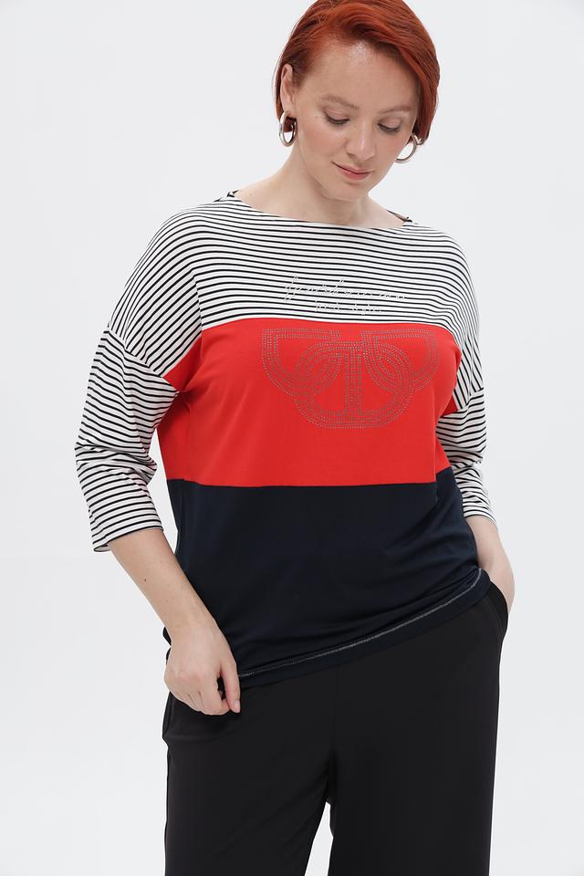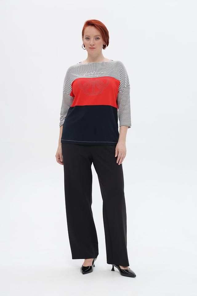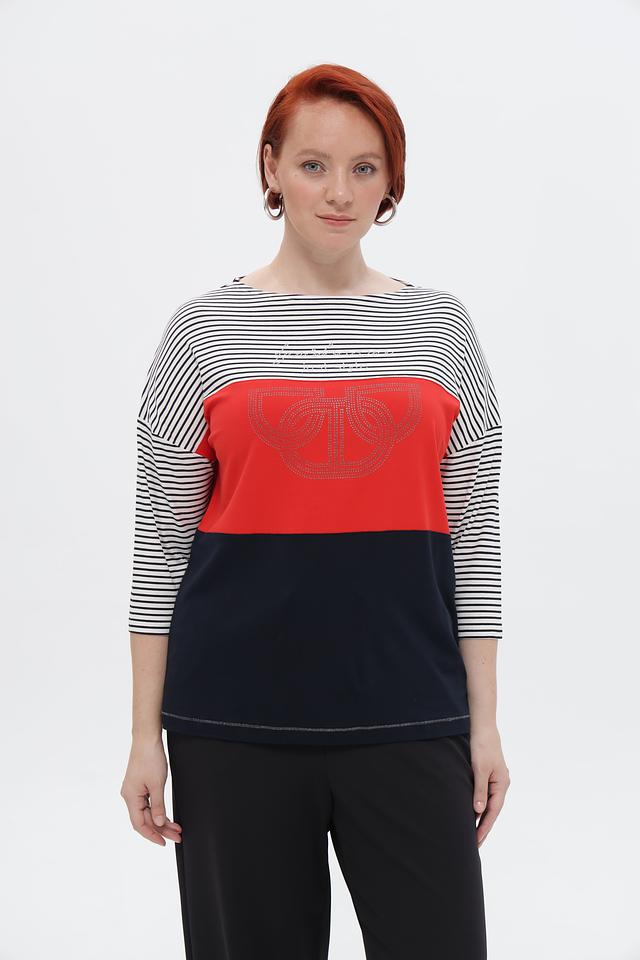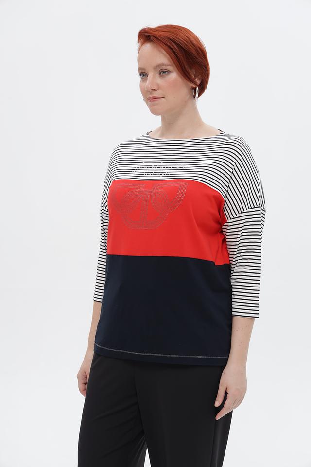 Особый акцент в дизайне – декоративный элемент со стразами, расположенный на красной вставке. Футболка имеет короткий рукав и приталенный силуэт, который подчеркивает фигуру.