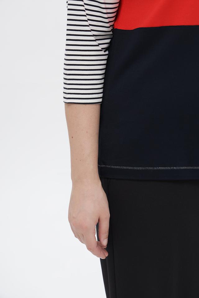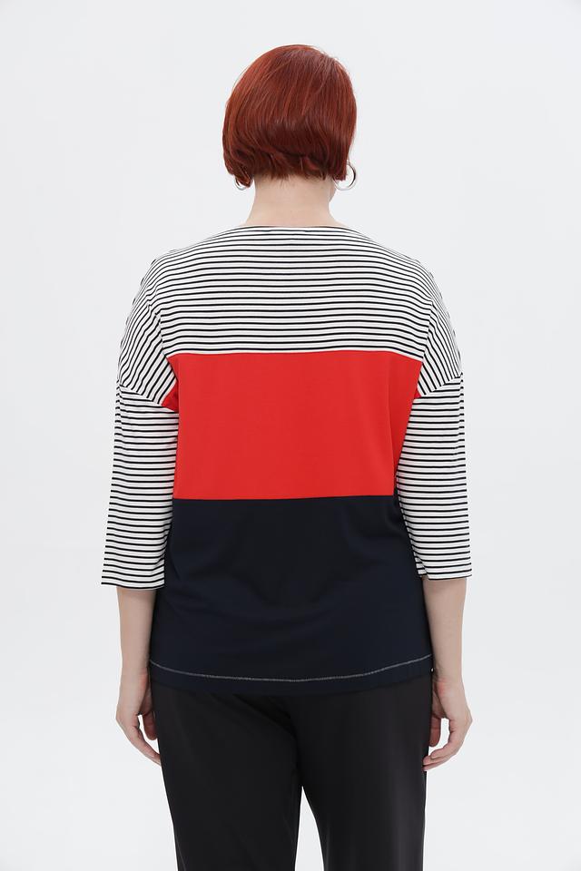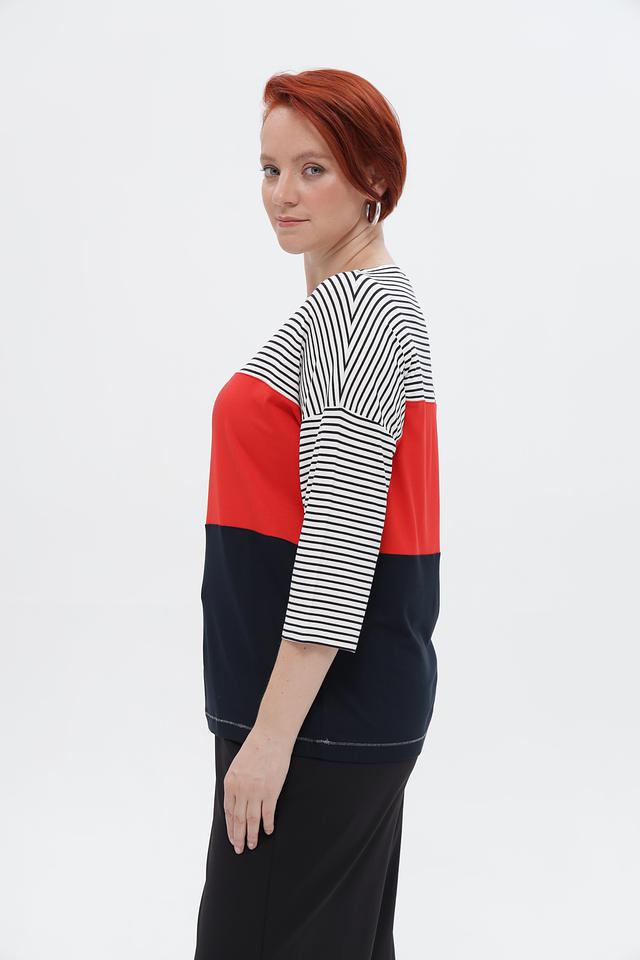 Женская футболка от Tuzzi – стильное и удобное решение для создания повседневного образа. Модель выполнена в сочетании нескольких цветов: синего, красного и бело-черной полоски, что придает ей оригинальность.