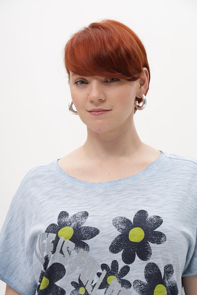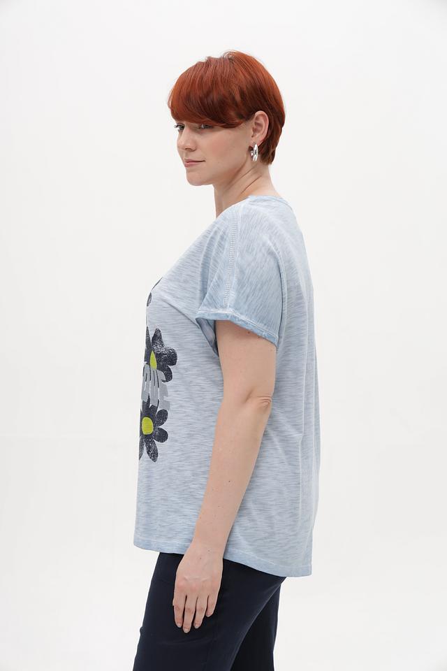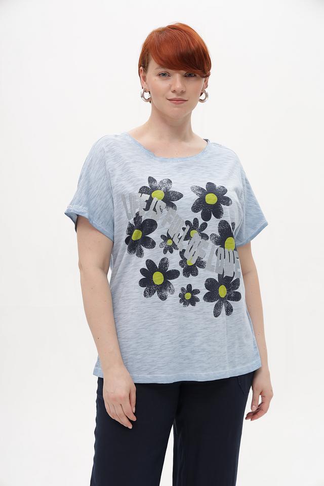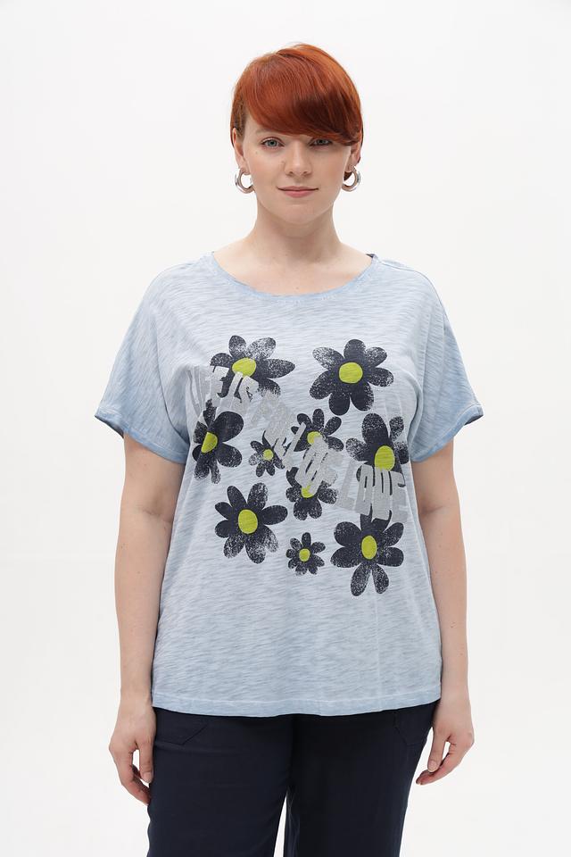 Женская футболка от Via Appia – это стильное и комфортное решение для повседневного образа. Футболка выполнена в приятном голубом цвете и украшена крупным цветочным принтом, сочетающим в себе чёрные, зелёные и серые оттенки.