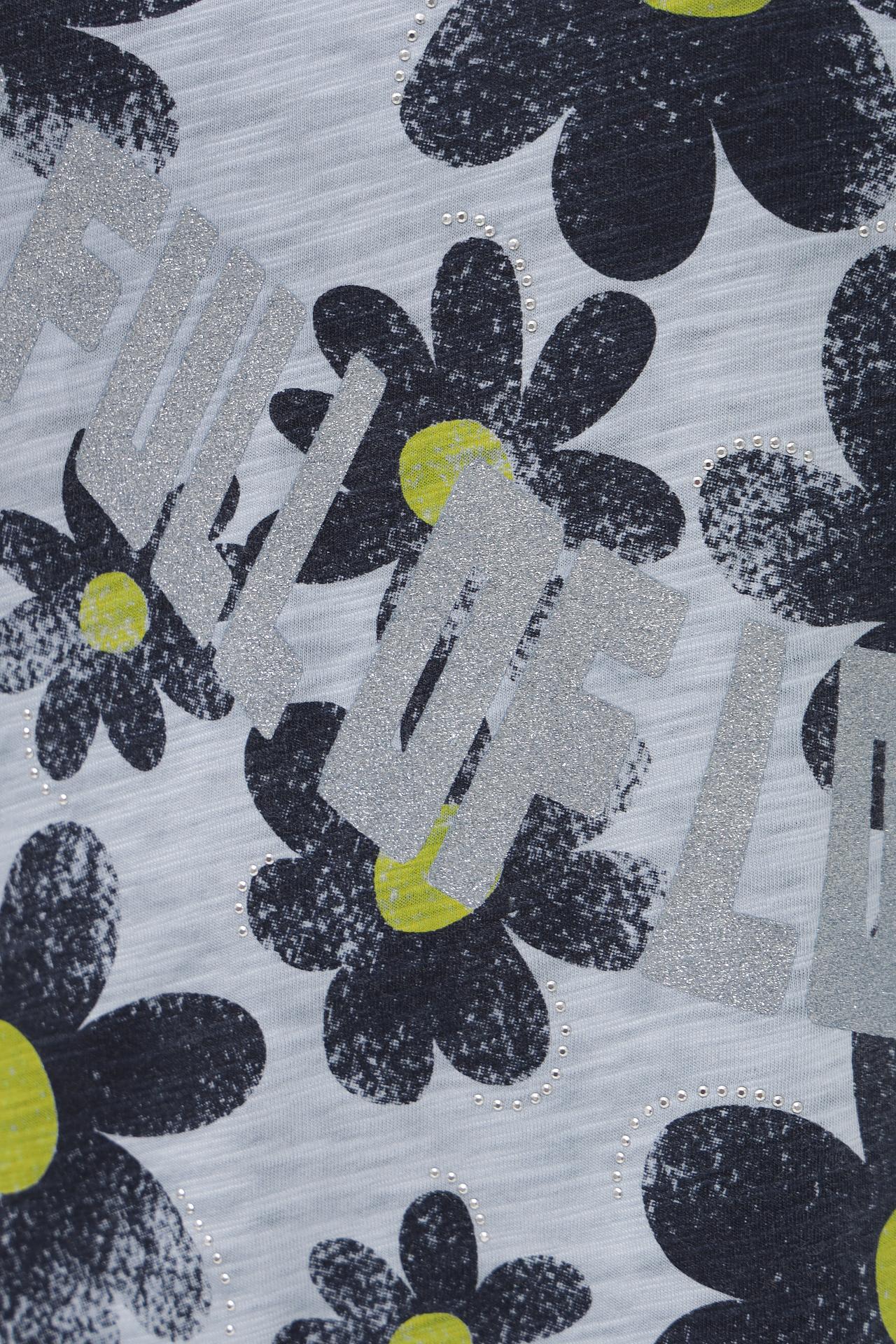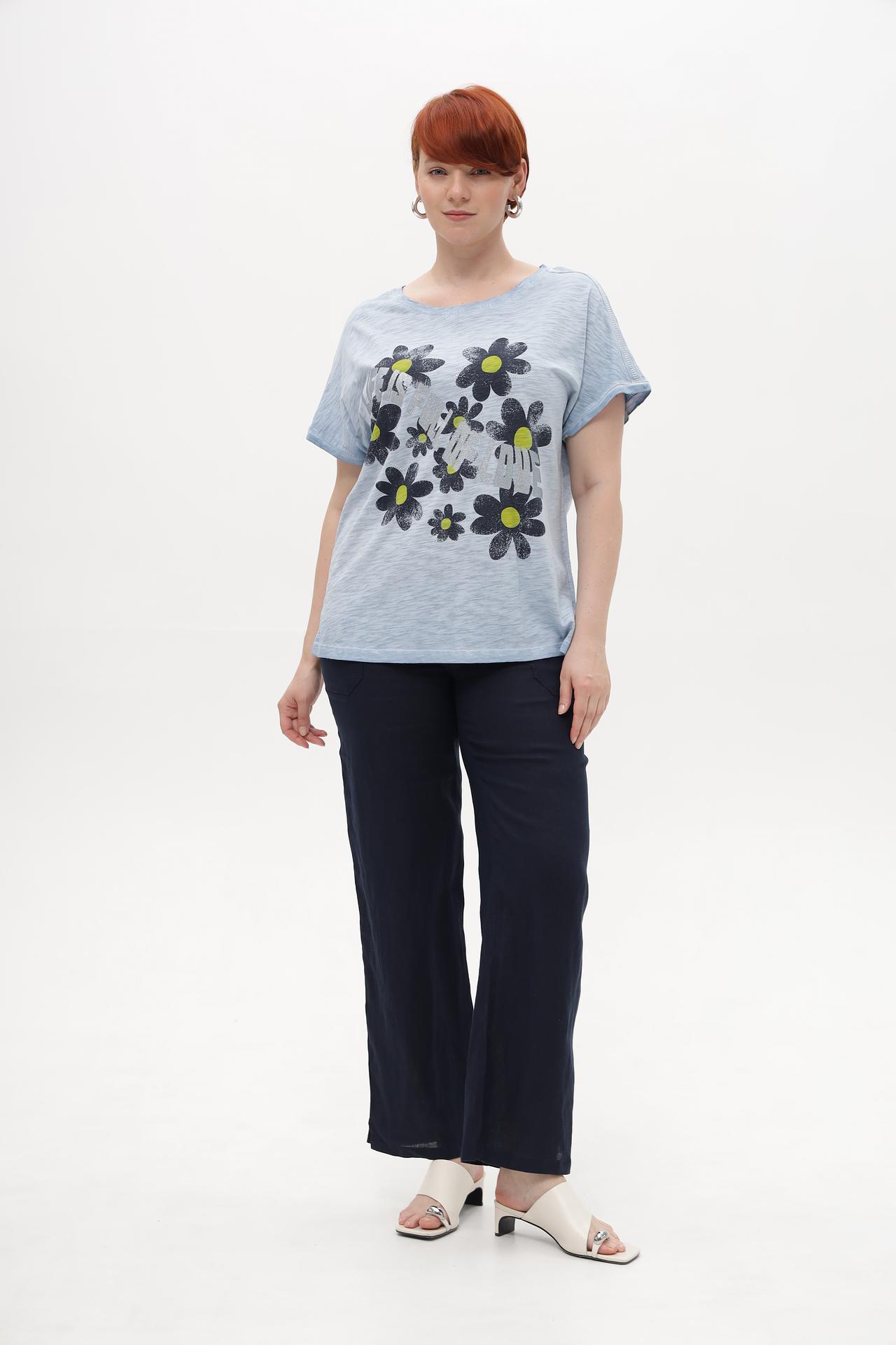 - Принт: Футболка украшена стильным цветочным принтом, который добавляет женственности и оригинальности образу.