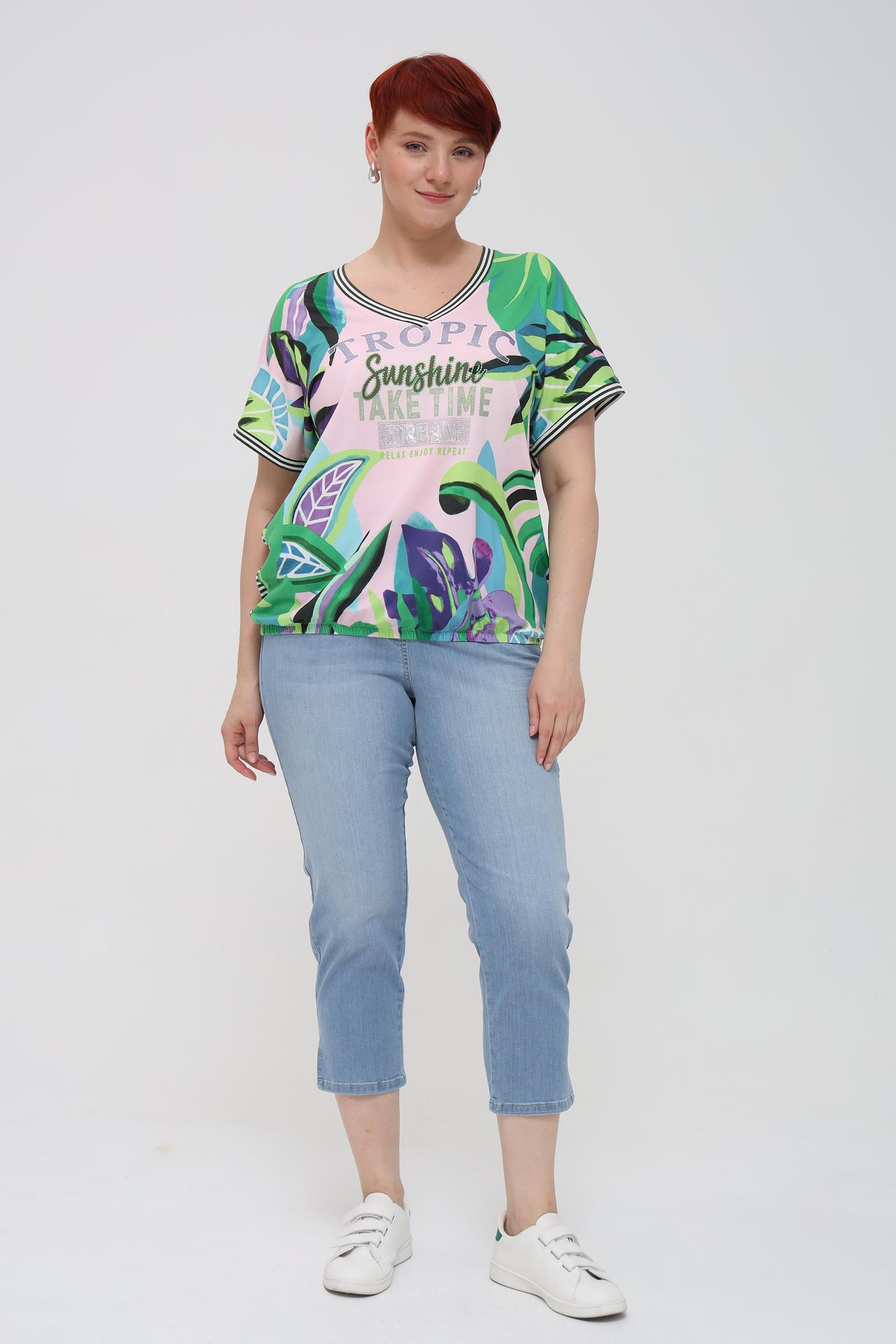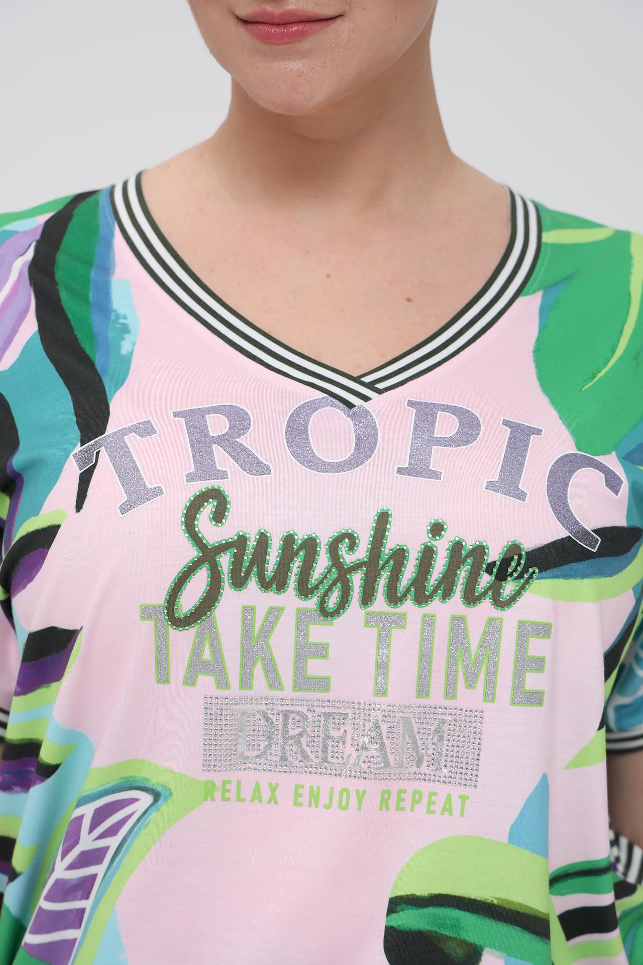 - Уникальный дизайн. Яркий тропический принт на розовом фоне с контрастными полосатыми элементами и стилизованной надписью с блестками придает футболке игривый и модный вид.
