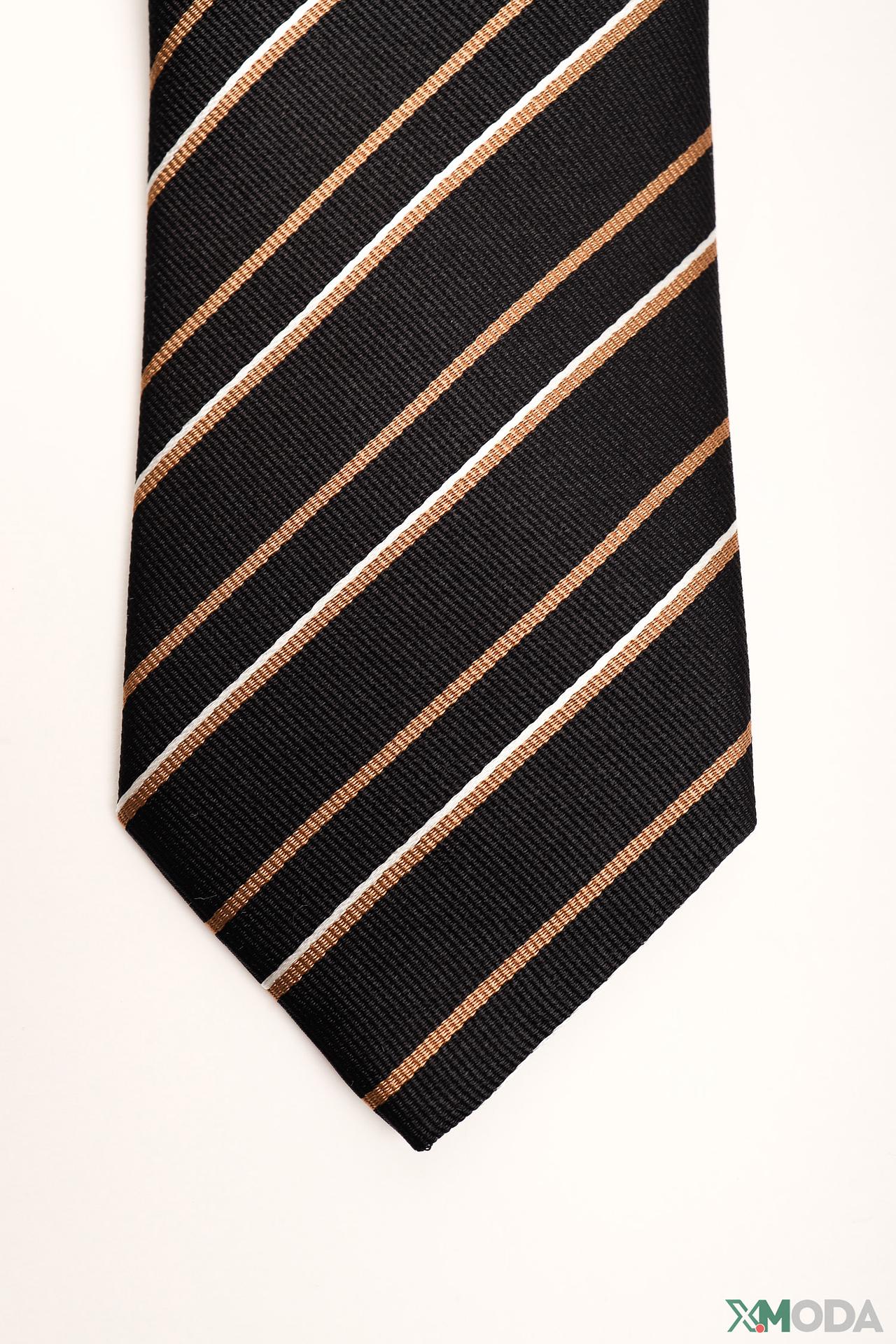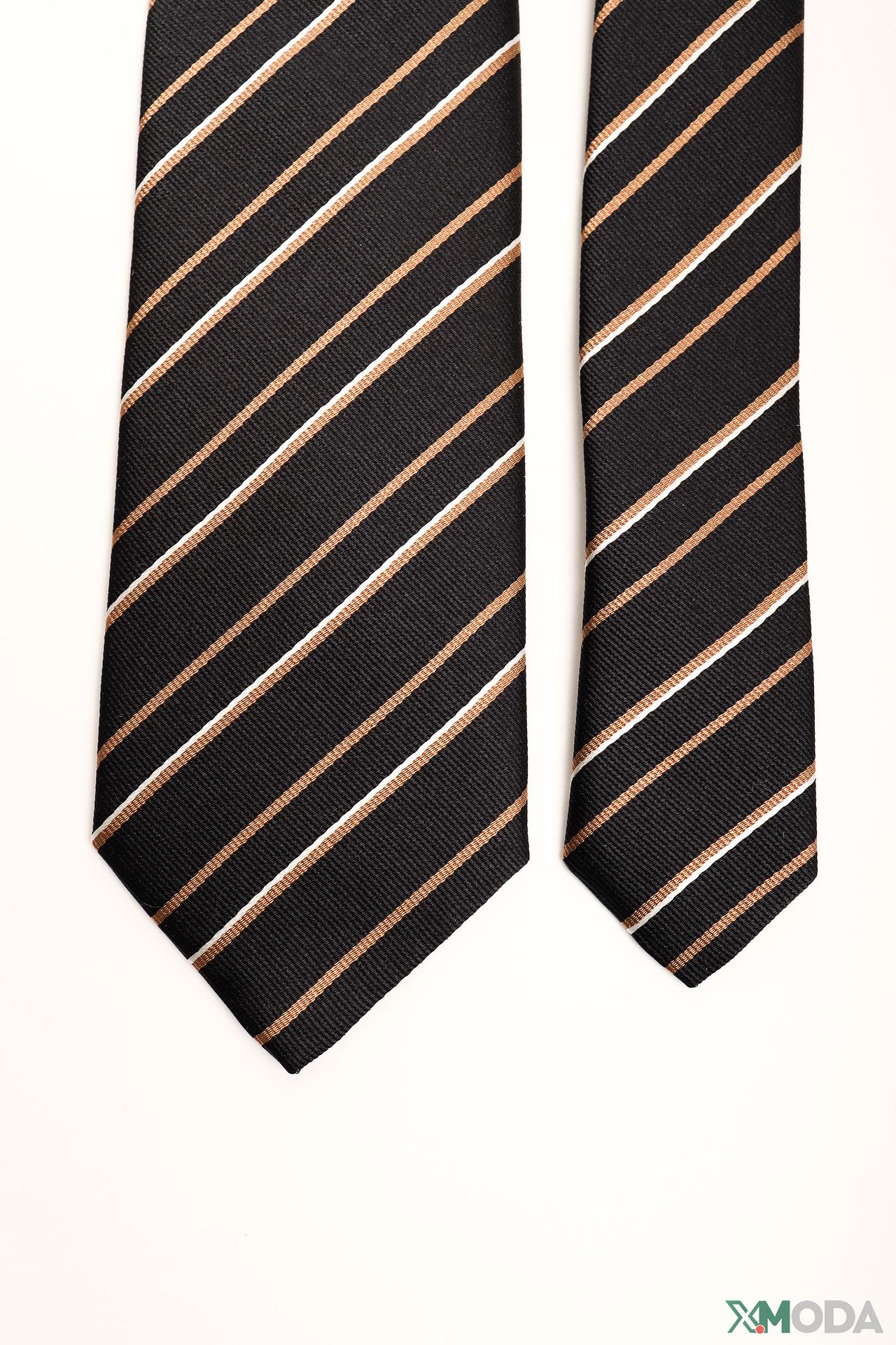 - Цветовое решение: Основной цвет – черный, с акцентами в виде тонких полос белого и золотисто-коричневого оттенка. Такое сочетание придает галстуку изысканность и глубину.