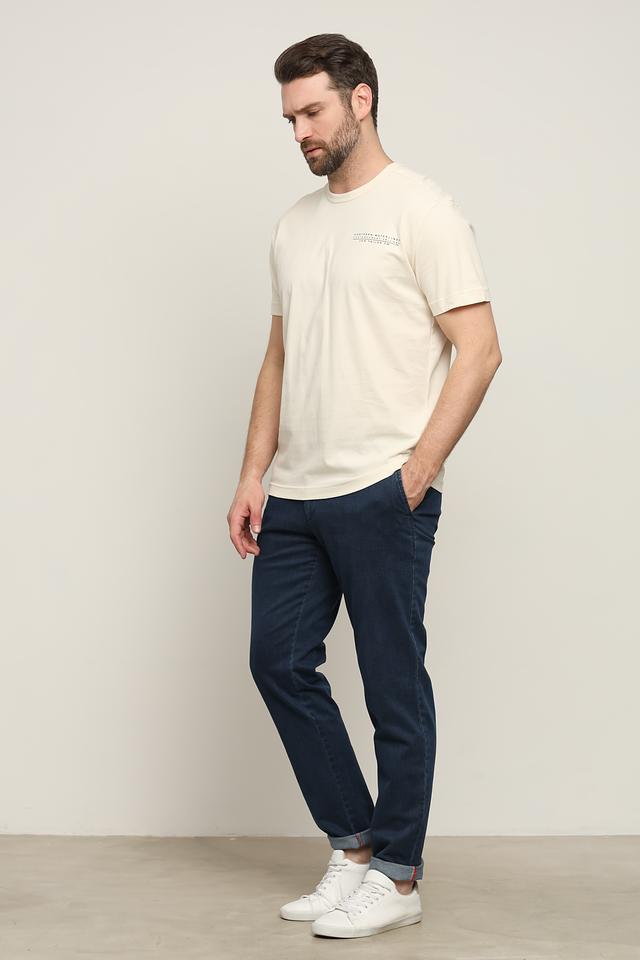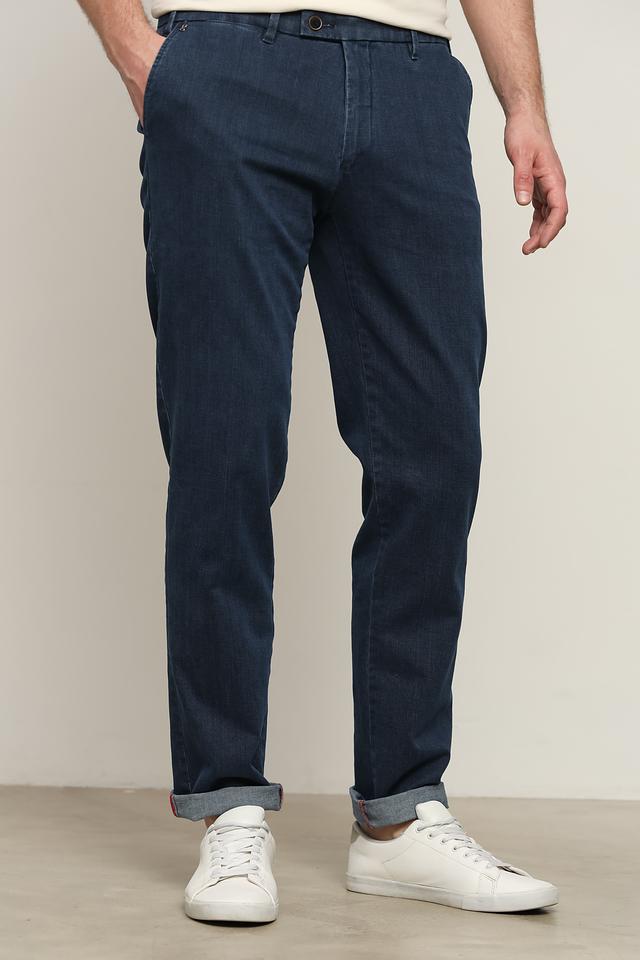 Данная модель оснащена стандартным поясом с петлями для ремня. Застежка – молния и пуговица. Брюки имеют два боковых кармана и два задних кармана с пуговицами. Ткань имеет легкую текстуру, напоминающую деним, но более мягкую и приятную на ощупь.