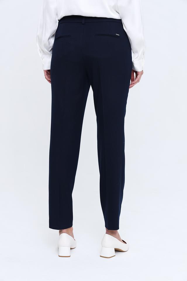 Брюки имеют прямой крой, стандартную посадку по талии и застежку на молнию с пуговицей. Ткань состоит из полиэстера (63%), вискозы (34%) и эластана (3%), что обеспечивает комфорт в носке, хорошую посадку и устойчивость к сминанию.