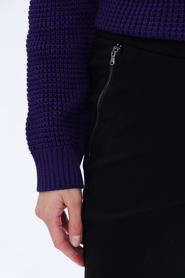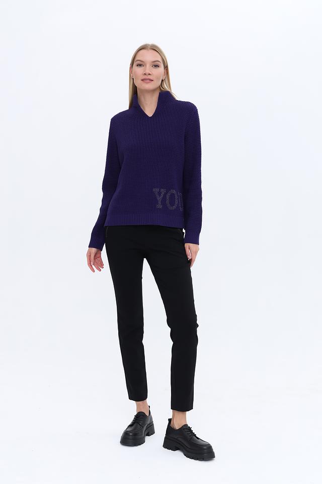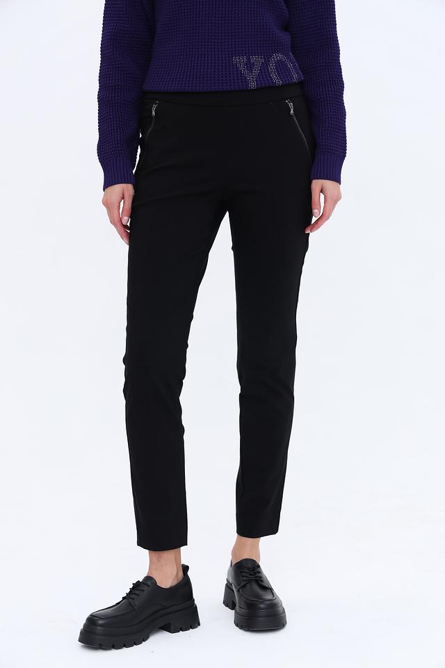 Особенностью модели являются декоративные молнии на карманах и по бокам брюк, которые придают им современный и стильный вид. Прямой крой и зауженные книзу штанины визуально удлиняют ноги и создают элегантный силуэт. Состав: вискоза 78%, полиамид 19%, эластан 3%.