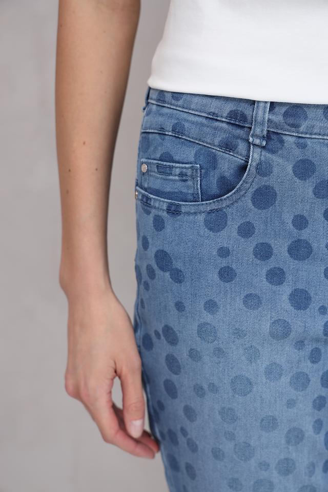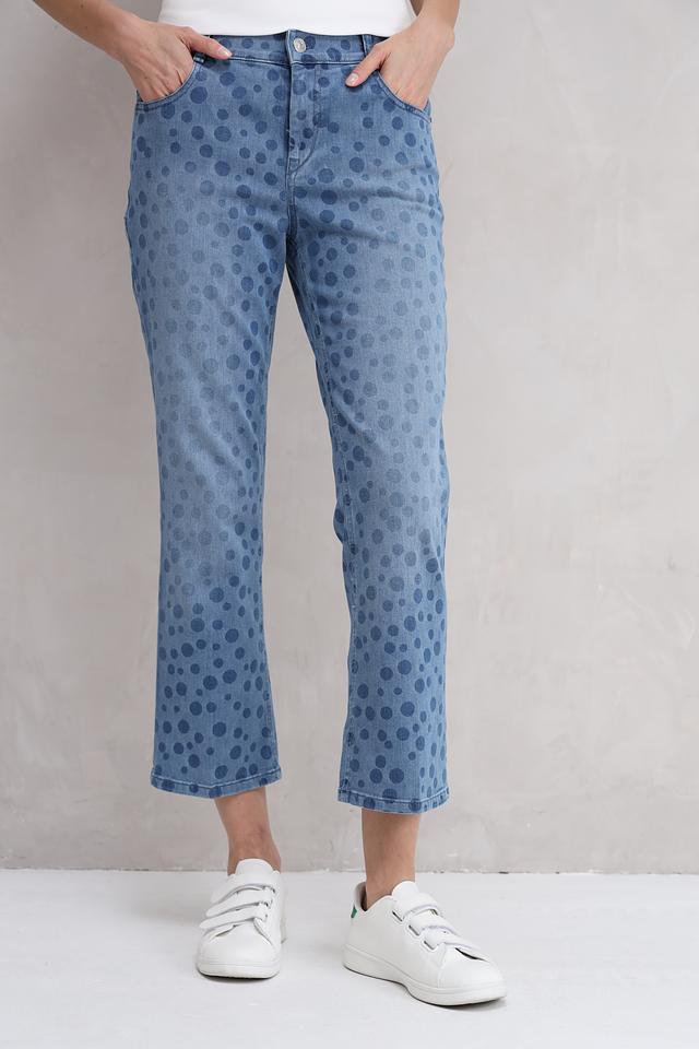 Женские джинсы Gardeur голубого цвета с оригинальным принтом в горошек. Модель выполнена из качественного хлопка с добавлением лиоцела и эластана для комфорта и хорошей посадки. Состав: хлопок 80%, лиоцел 15%, эластан 5%