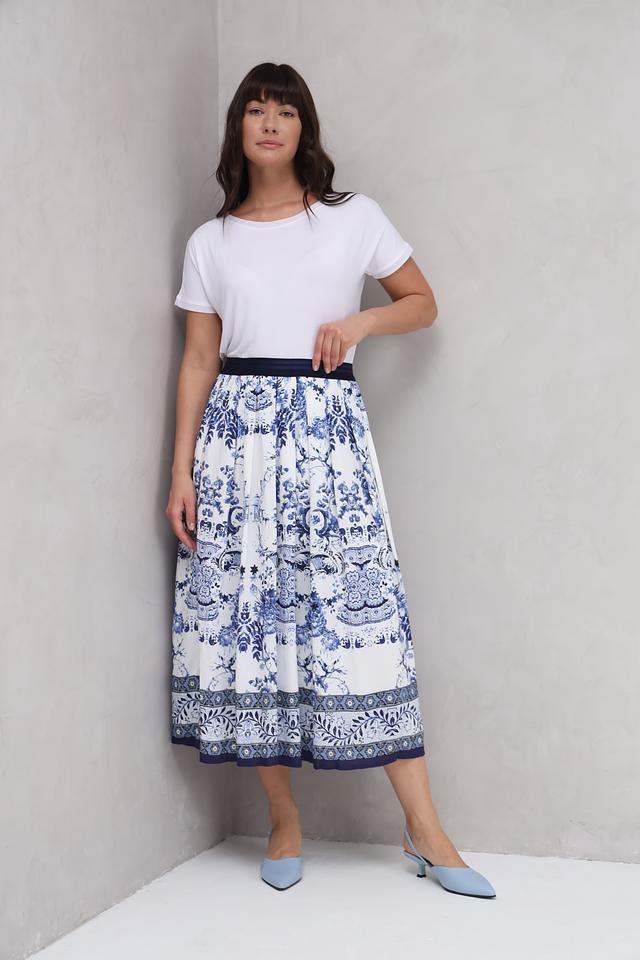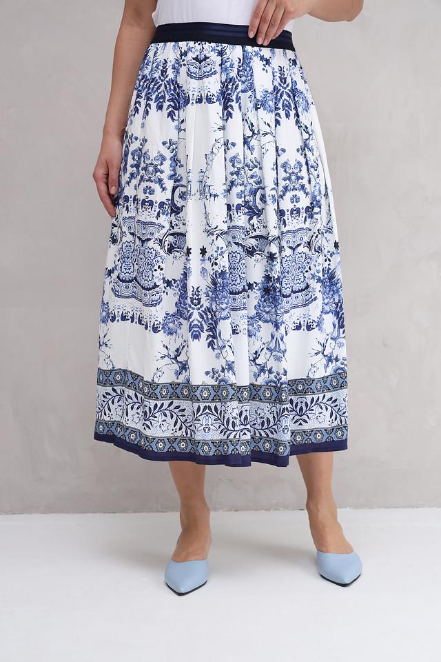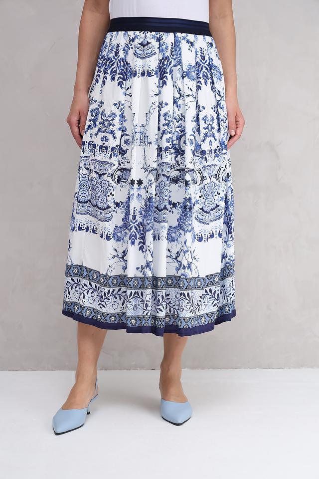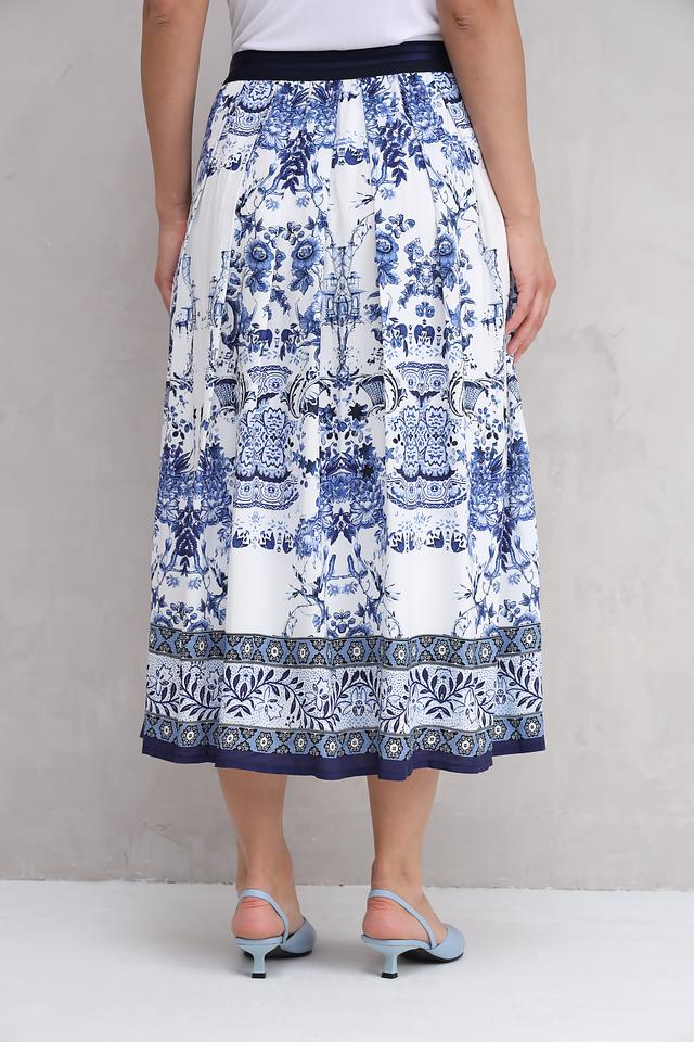 Основной цвет юбки – белый, а ее поверхность украшена детализированным цветочным принтом в различных оттенках синего. Принт выполнен в стиле старинной керамики, что придает юбке особый шарм и изысканность.