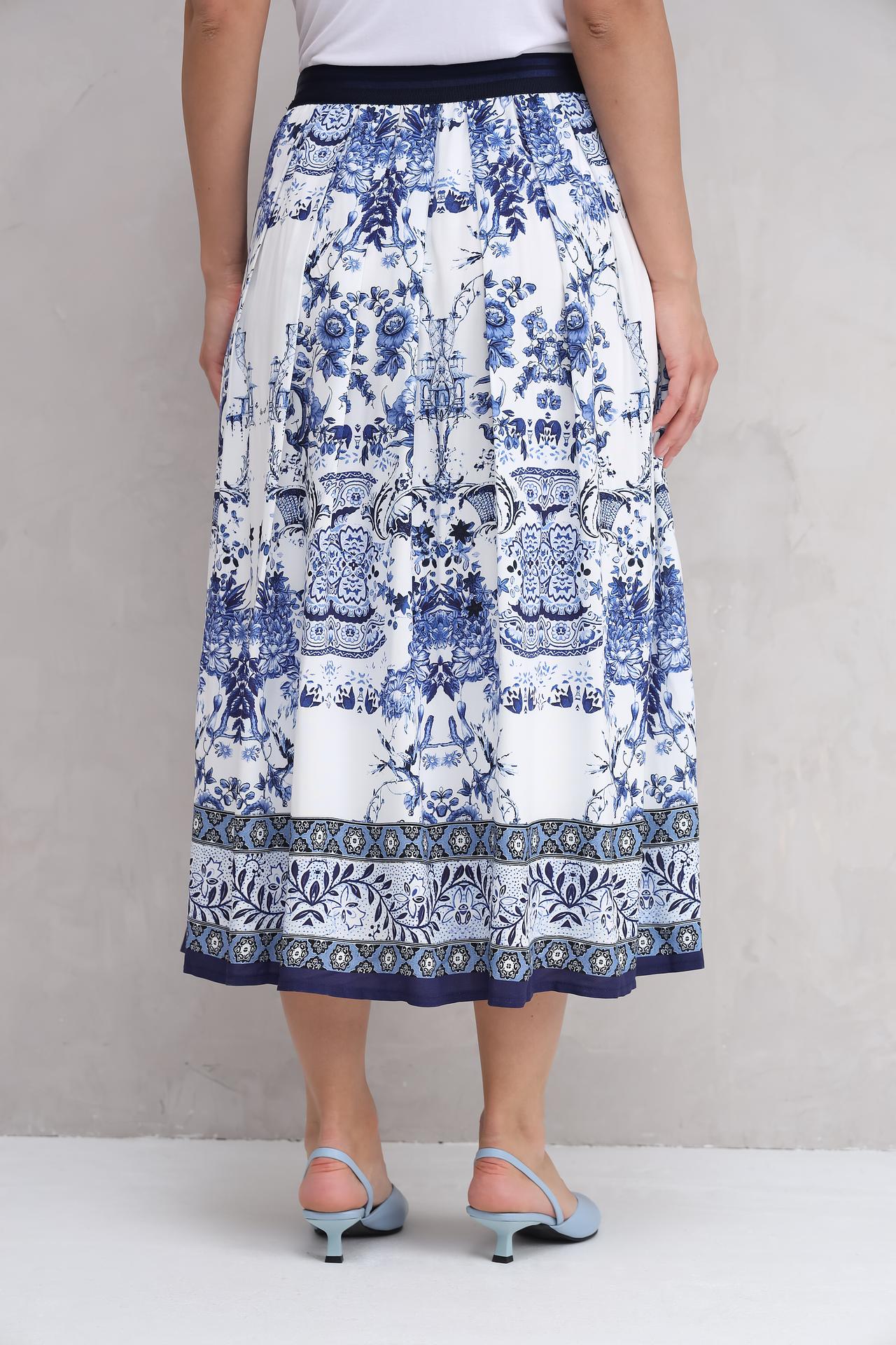 - Оригинальный дизайн. Узор в сине-белых тонах делает эту юбку запоминающейся и стильной.