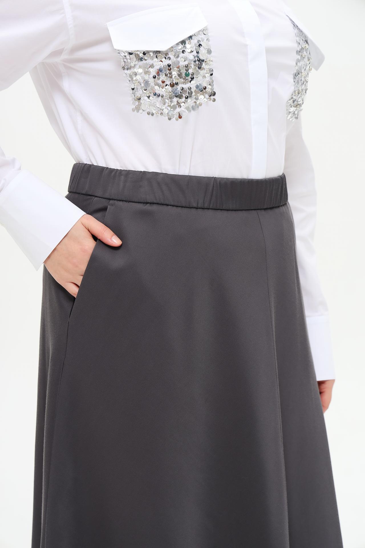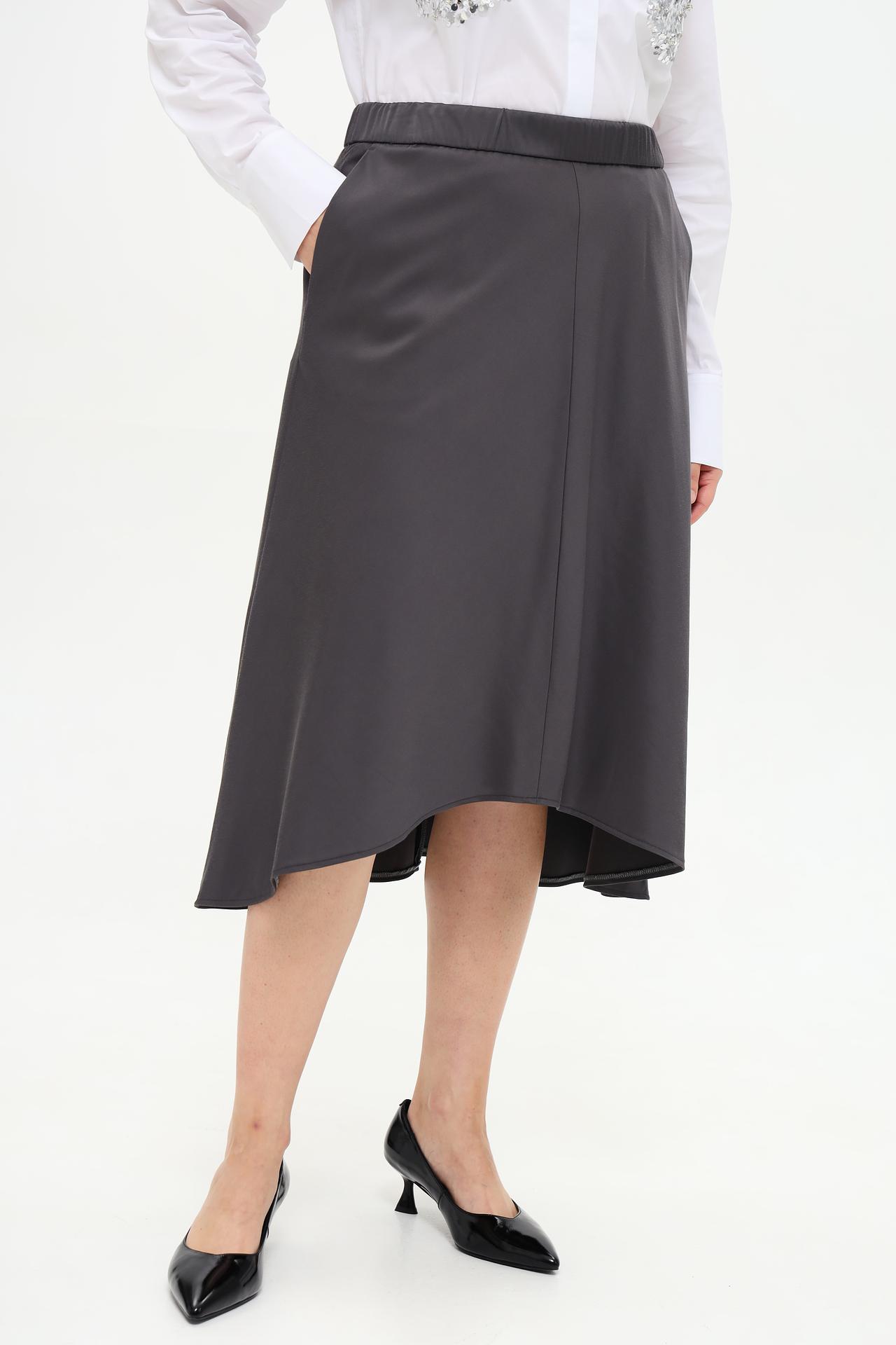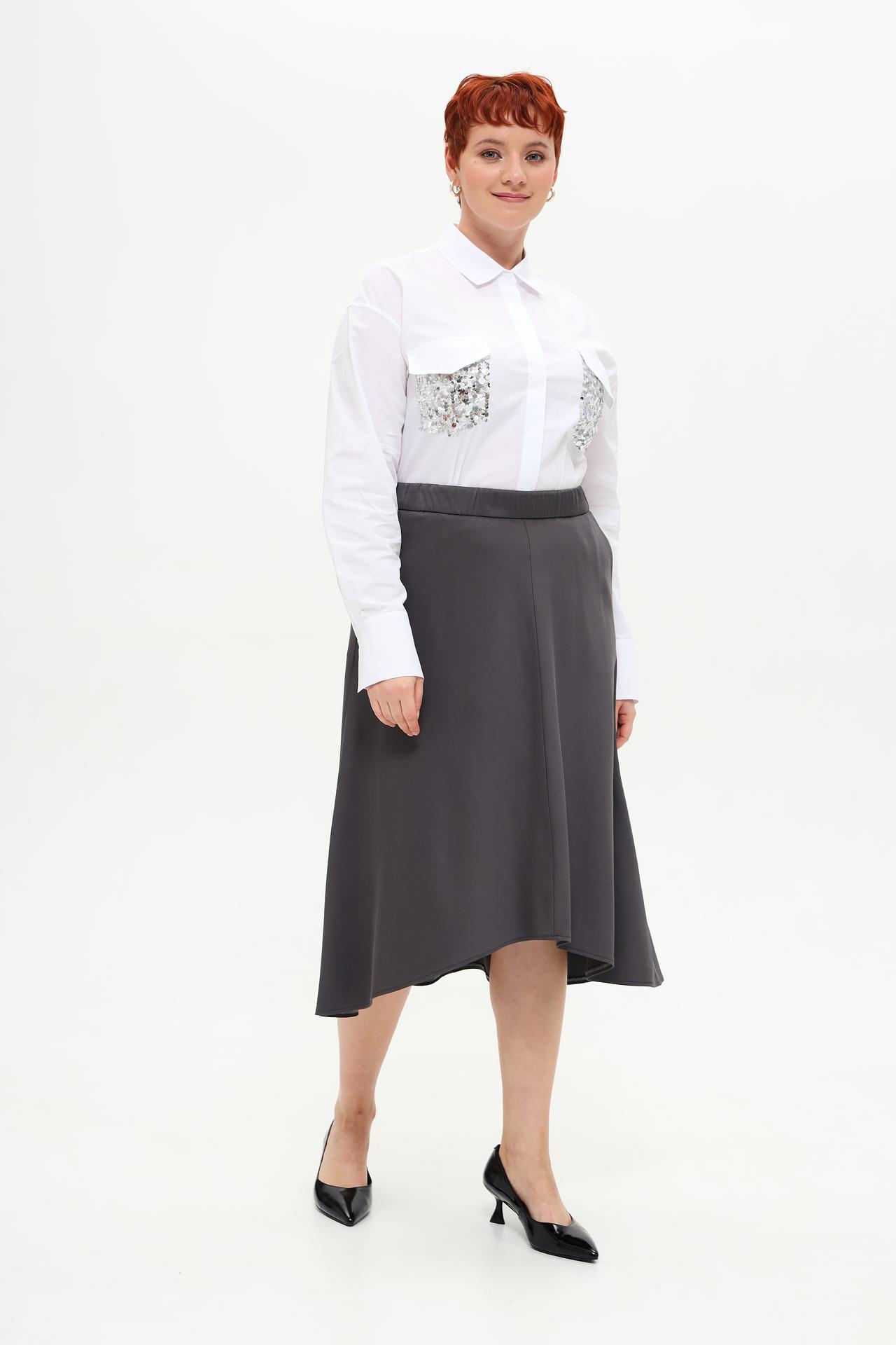 - Крой: Асимметричный крой подола придает юбке динамичность и визуально удлиняет ноги, делая образ более женственным.