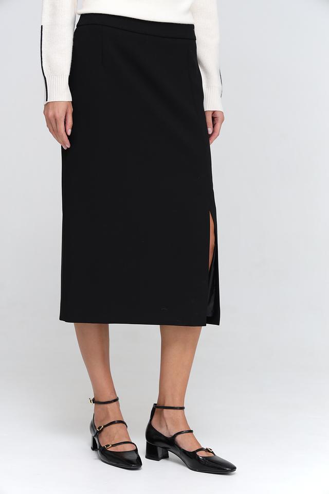 Юбка имеет прямую, слегка приталенную форму и длину миди. Особенностью модели является разрез сзади, который добавляет образу динамичности и лёгкости. Благодаря эластану в составе, юбка хорошо тянется и обеспечивает комфорт при носке.