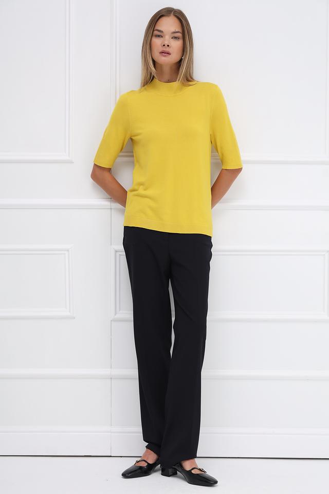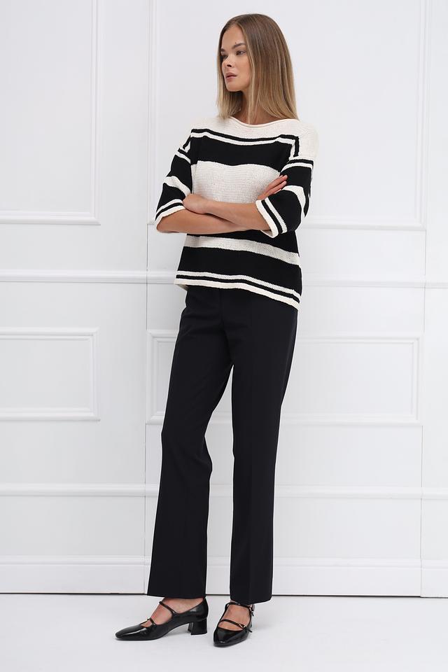 Брюки имеют прямой крой, который обеспечивает комфортную посадку по фигуре. Высокая посадка визуально удлиняет ноги и подчеркивает талию. Стандартная длина позволяет сочетать брюки с различной обувью.