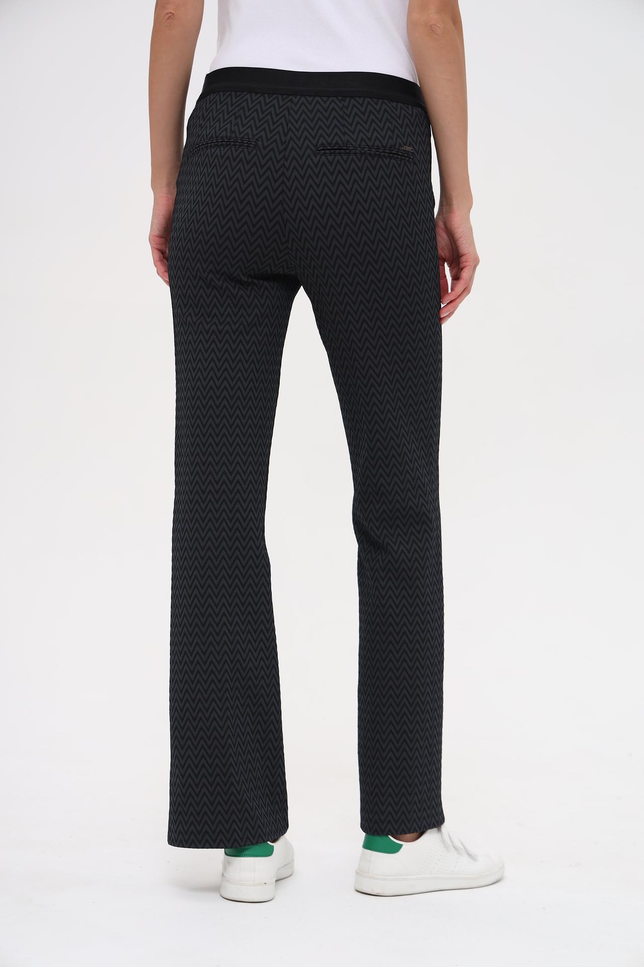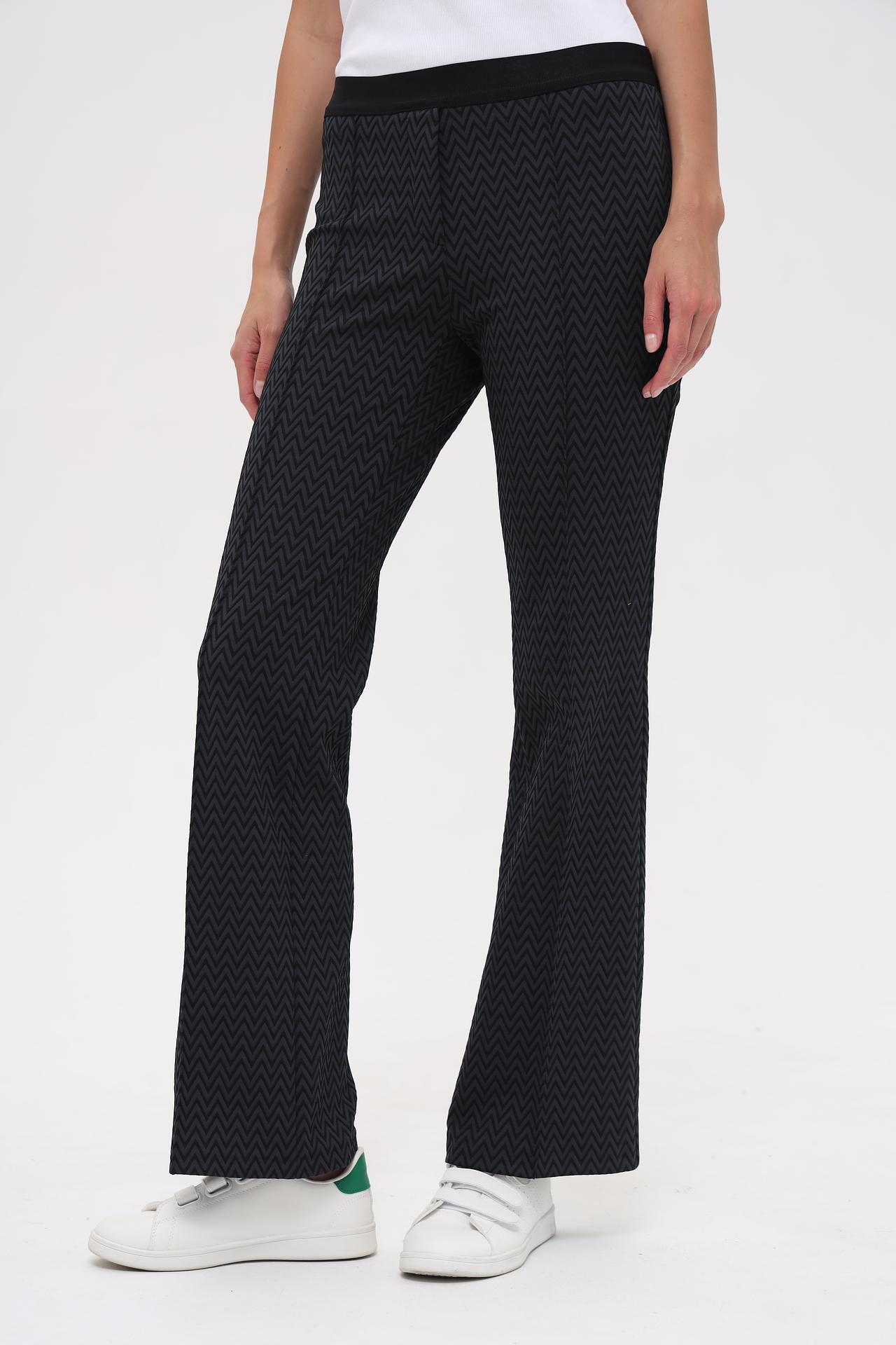 - Дизайн: Классический крой брюк-клёш от бедра визуально удлиняет ноги. Оригинальный принт в виде зигзагов придаёт модели современный вид и делает её универсальной для сочетания с различными топами и блузками.