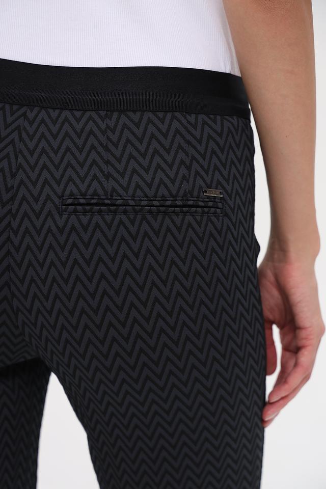 Женские брюки Gardeur чёрного цвета с оригинальным геометрическим узором зигзаг. Модель выполнена из эластичного материала с высокой посадкой и слегка расклешенным силуэтом, обеспечивающим комфорт и свободу движений. Состав: полиамид 98%, эластан 2%