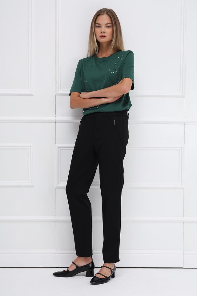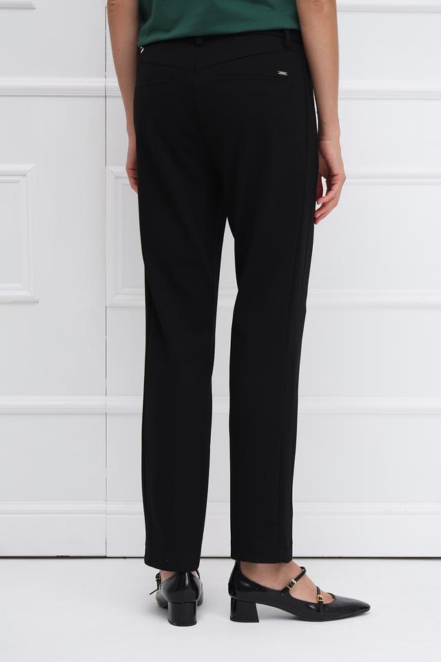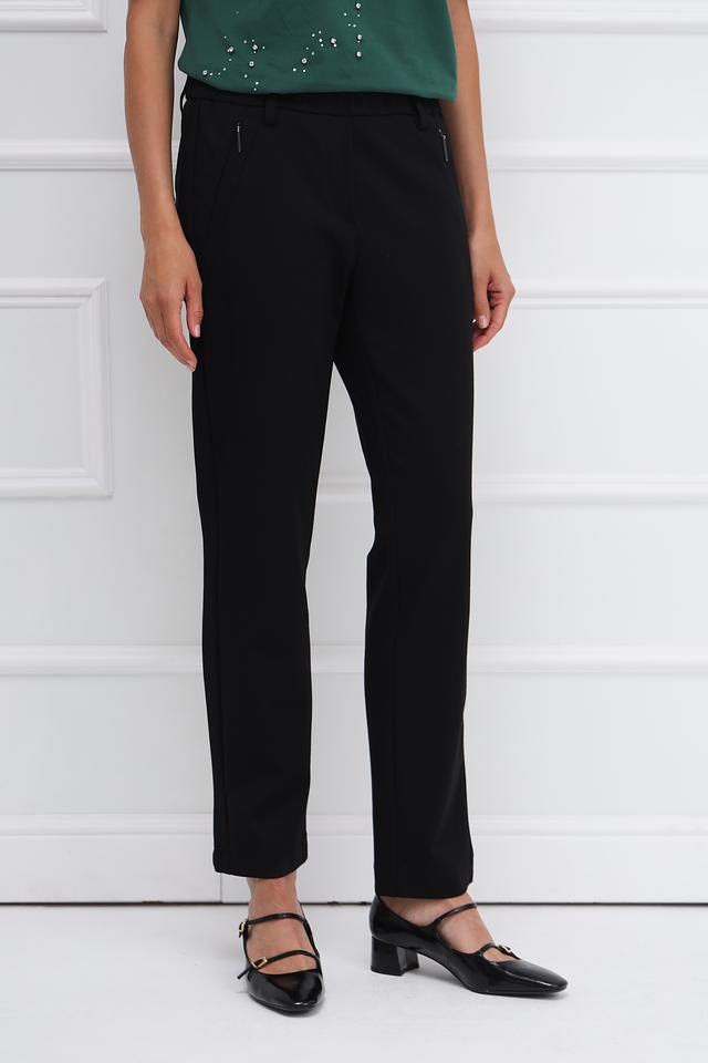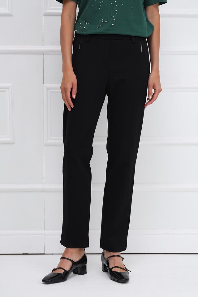 Брюки имеют прямой крой, который визуально вытягивает силуэт и обеспечивает комфорт при носке. Ткань, состоящая из вискозы, полиамида и эластана, приятна к телу, хорошо держит форму и позволяет коже дышать.