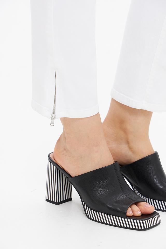 Джинсы имеют прямой крой, который подчеркивает фигуру, не сковывая движений. Высокая посадка обеспечивает комфортную посадку по талии. Особенностью модели являются разрезы по низу штанин, добавляющие образу современный акцент.