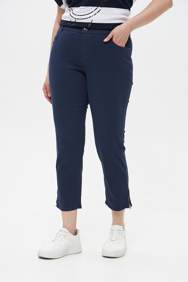 Оригинальным элементом дизайна являются молнии, расположенные на щиколотках, что добавляет брюкам современный акцент. Состав ткани обеспечивает приятные тактильные ощущения и долговечность изделия: 81% хлопок, 17% лиоцел, 2% эластан.