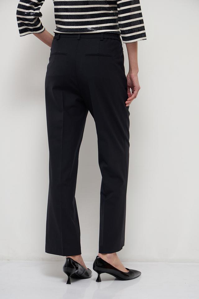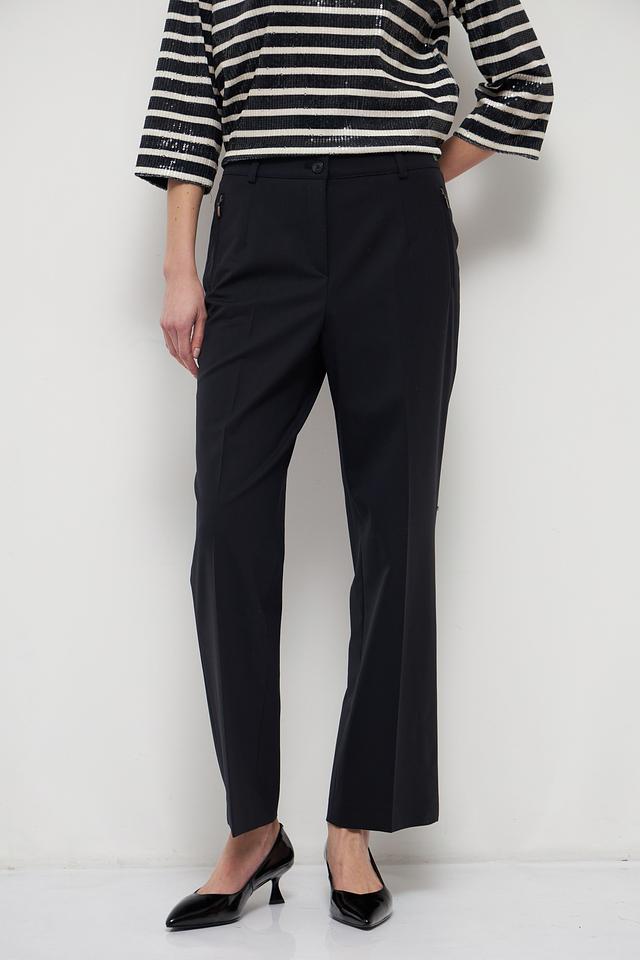 Брюки имеют прямой крой, который обеспечивает свободу движений и подходит для разных типов фигуры. Высокое качество материалов гарантирует комфорт при носке и долговечность изделия. Состав брюк: 54% полиэстер, 41% шерсть, 5% эластан.