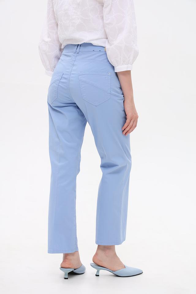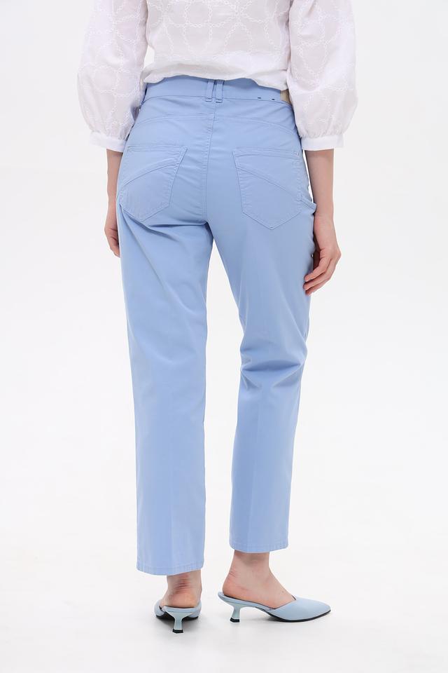Модель имеет классический крой, пояс с шлевками и пять функциональных карманов. Застежка — молния и пуговица. Цвет — нежный голубой.