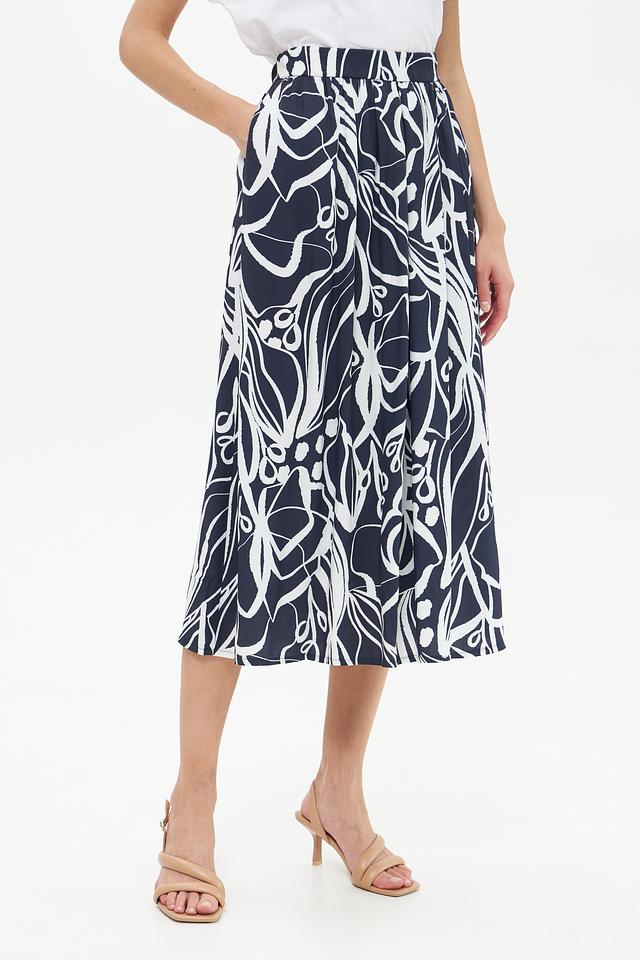 Юбка имеет высокую посадку и свободный крой, обеспечивающий комфорт и свободу движений. Декорирована эффектным принтом в виде стилизованных растительных элементов синего и белого цвета.