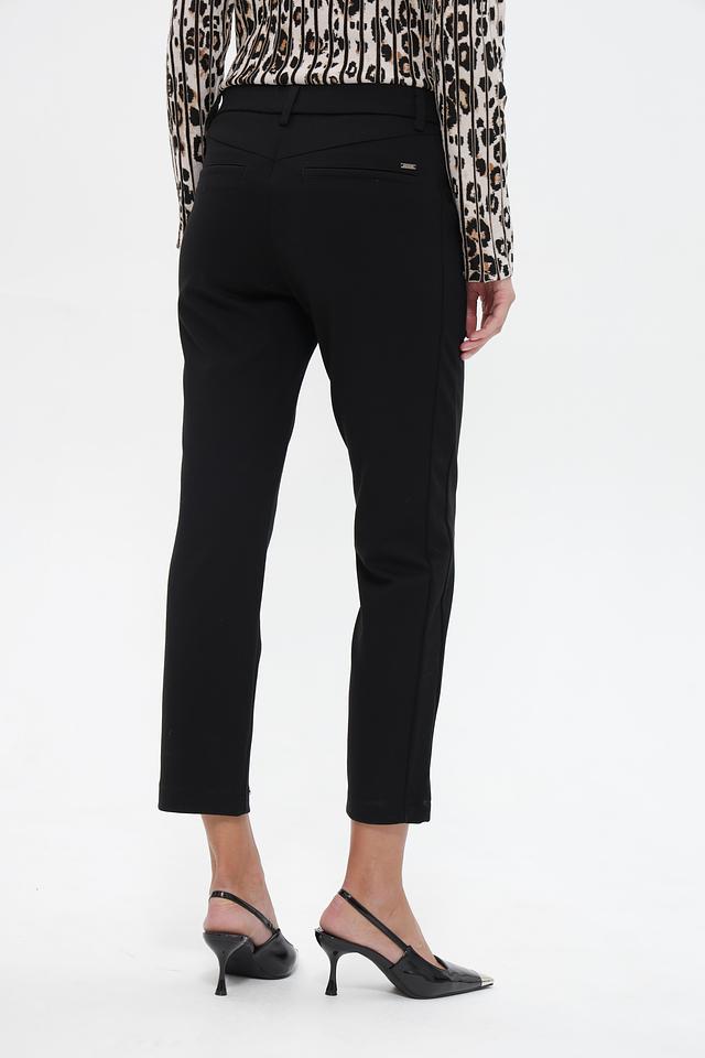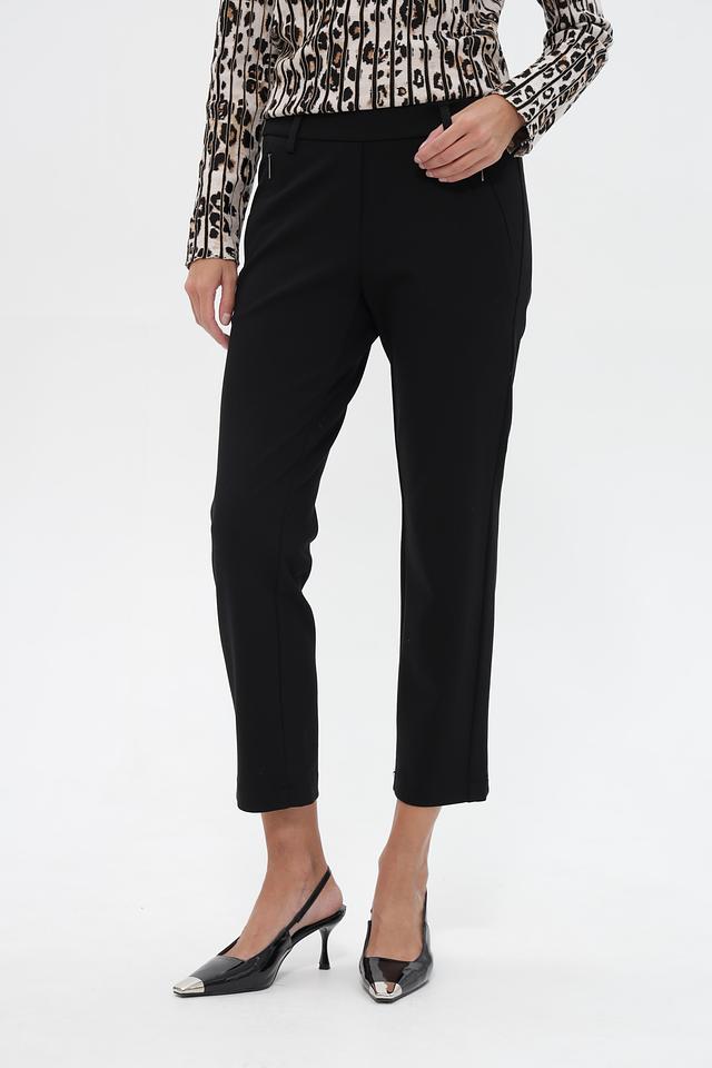 Брюки имеют прямой крой и укороченную длину, что придает им современный вид. Пояс на резинке обеспечивает комфортную посадку по фигуре. Наличие боковых карманов добавляет практичности.