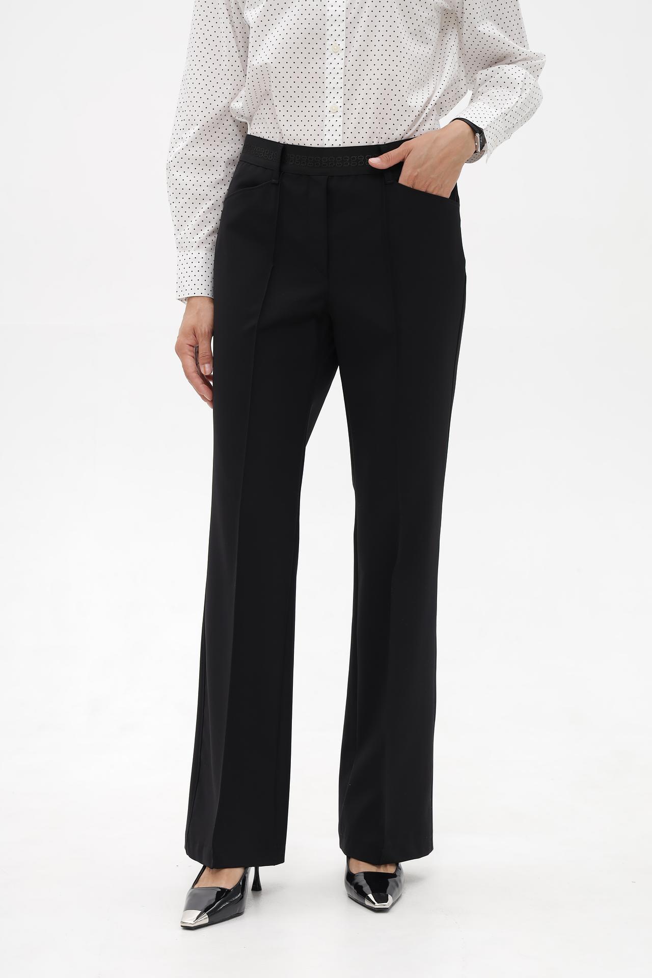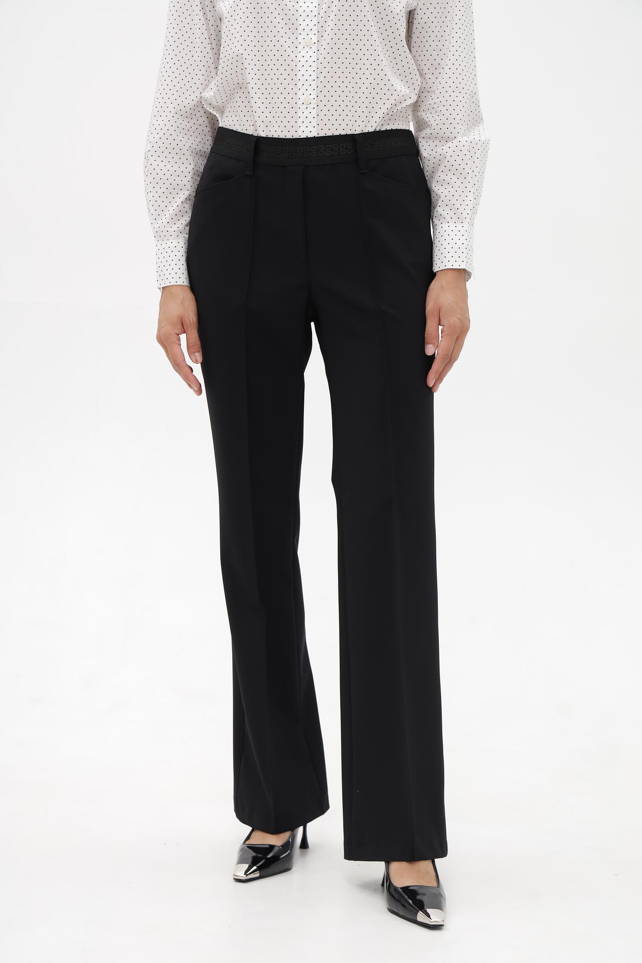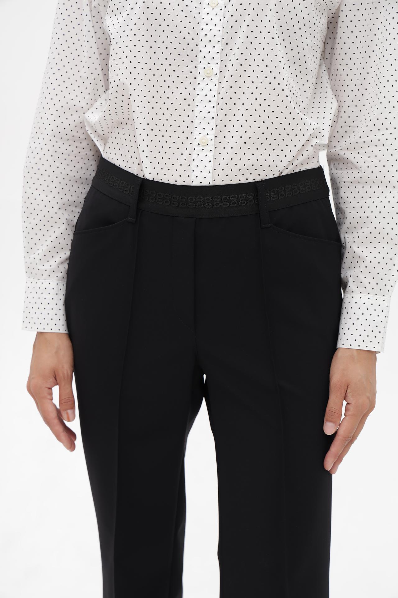 - Детали: Элегантные стрелки, проходящие по всей длине брюк, придают изделию особую изысканность и структуру. Пояс брюк дополнен декоративной брендированной лентой, добавляющей изюминку.