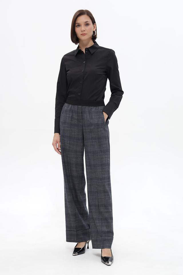 Брюки имеют широкий крой и высокую посадку, обеспечивающие свободу движений и подчеркивающие талию. Эластичный пояс гарантирует комфортную посадку по фигуре. Наличие боковых карманов добавляет функциональности.