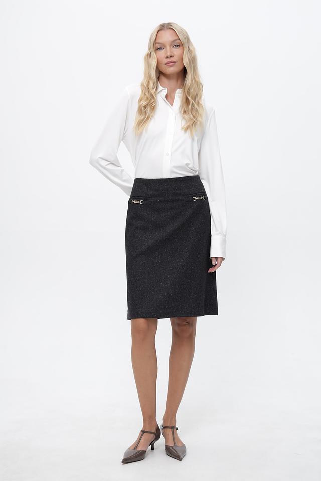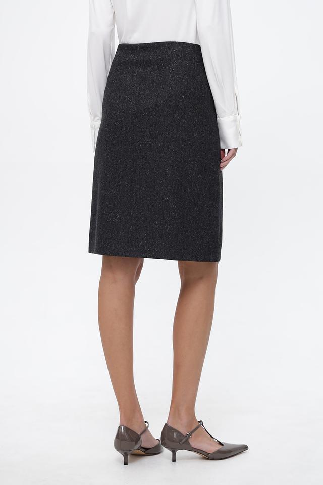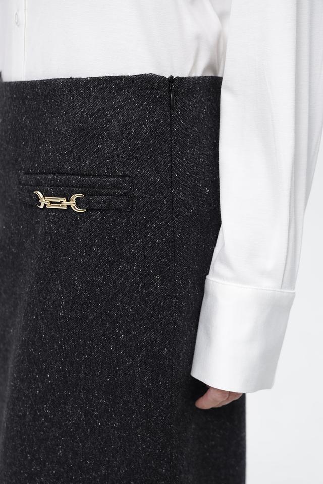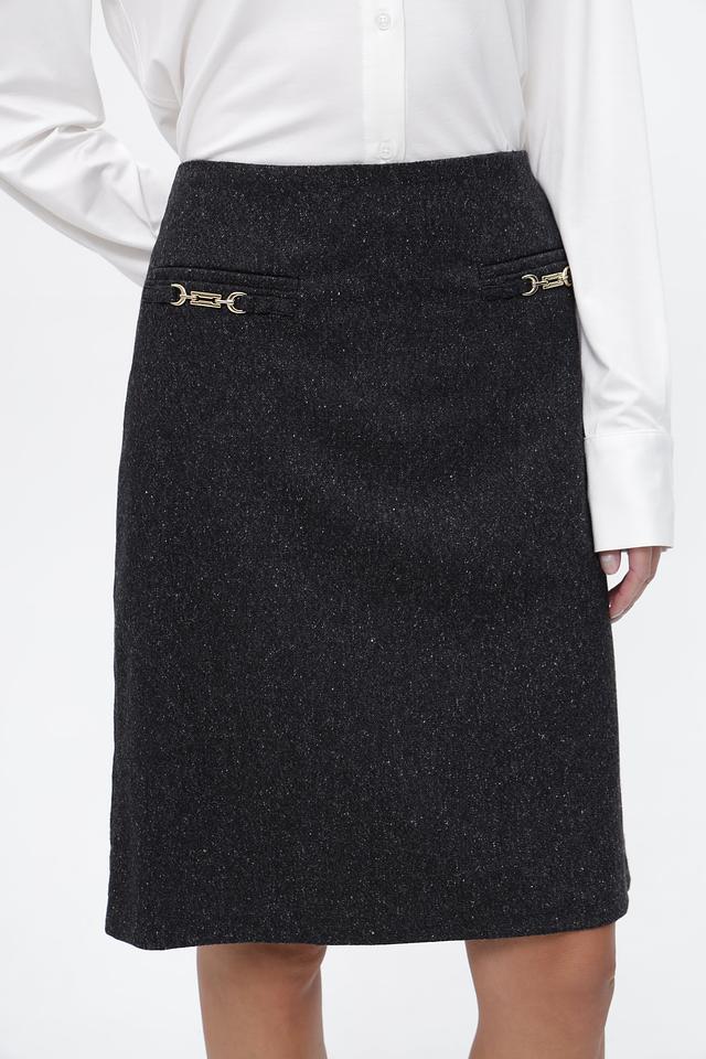 Юбка имеет серый цвет с небольшим вкраплением черных нитей, что создает эффект “меланж”. На талии расположены две декоративные пряжки золотистого цвета, которые придают изделию элегантность и изысканность. Застежка-молния расположена сзади.