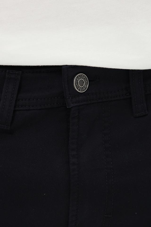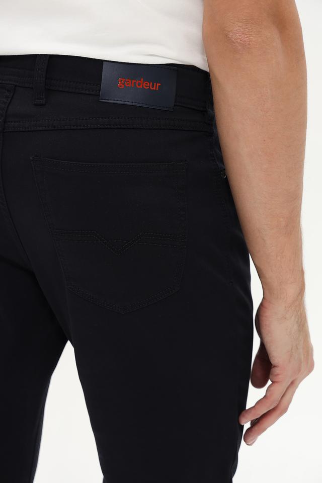 Дизайн брюк отличается лаконичностью и функциональностью. Прямой крой и классическая посадка делают их универсальными для различных типов фигуры. На поясе расположены петли для ремня, а задние карманы оформлены аккуратными швами. Наличие фирменного логотипа Gardeur на заднем кармане подчеркивает высокое качество изделия.