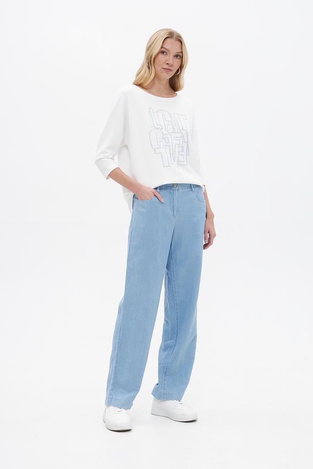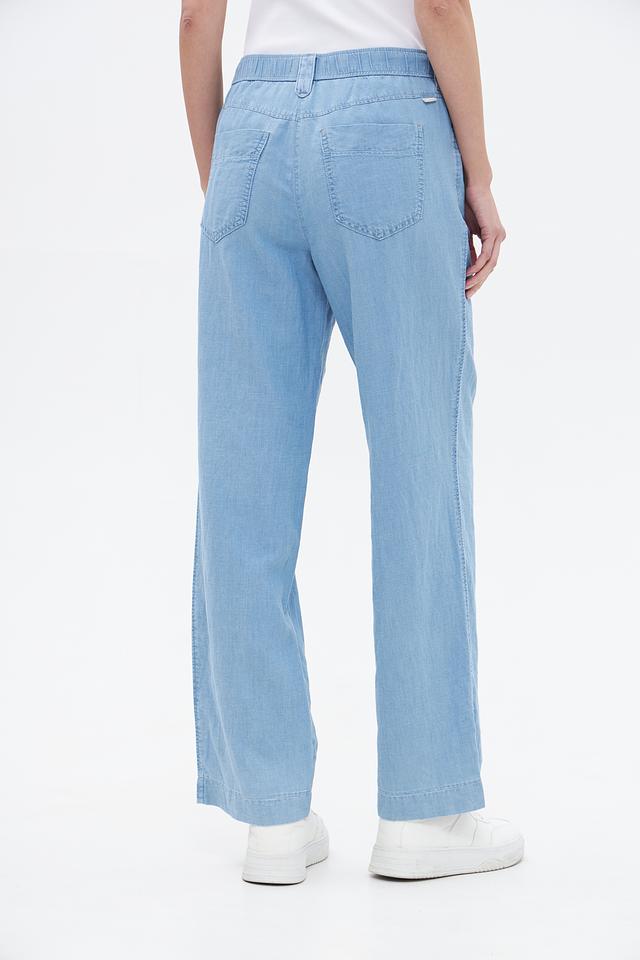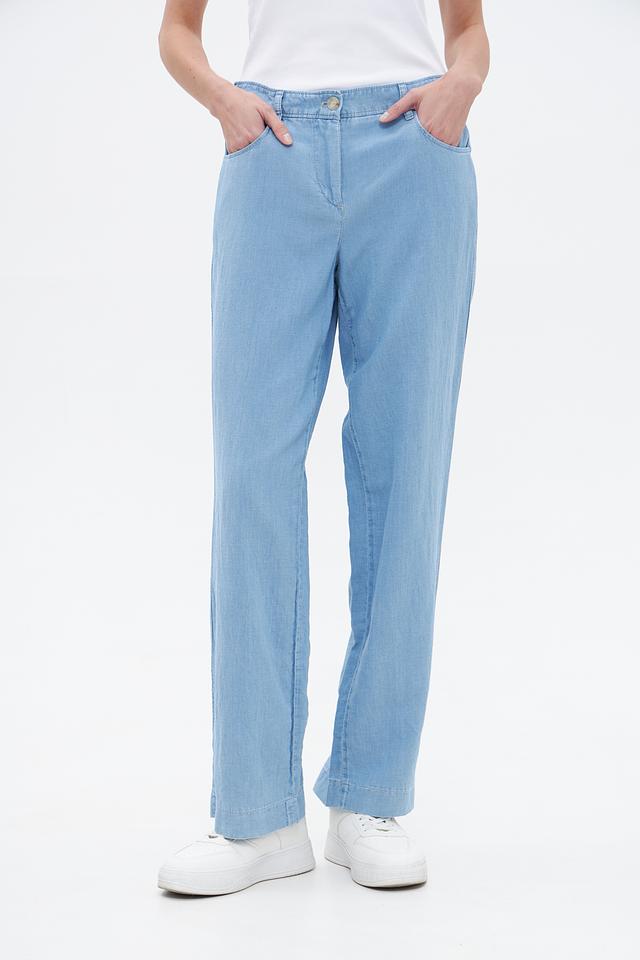 Женские брюки Gardeur голубого цвета прямого кроя, выполнены из хлопка с добавлением льна и лиоцелла. Модель с эластичным поясом и боковыми карманами для комфортной носки. Состав: хлопок 50%, лен 25%, лиоцел 25%