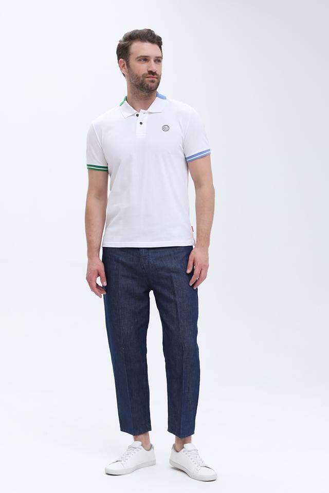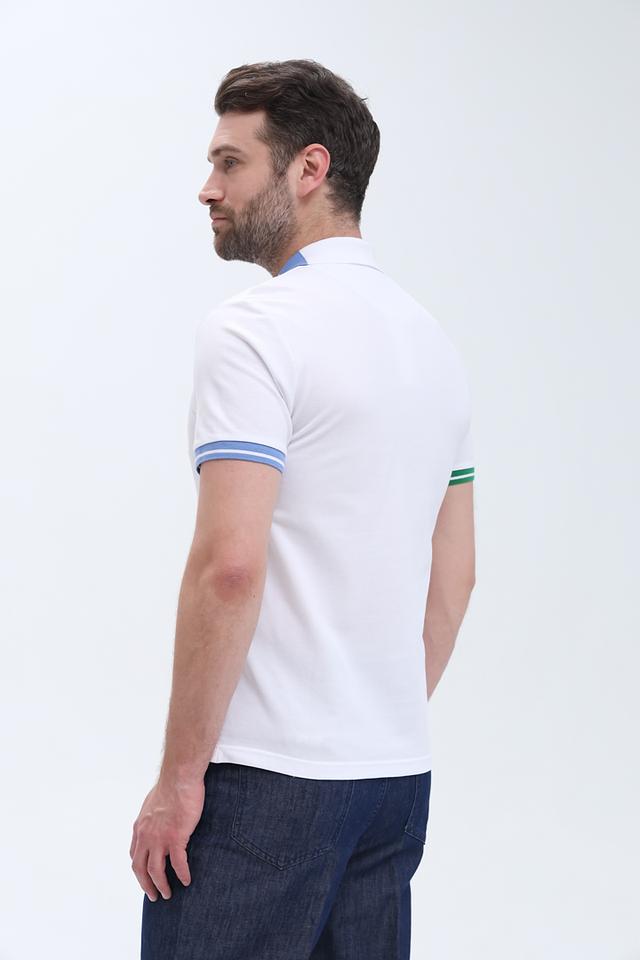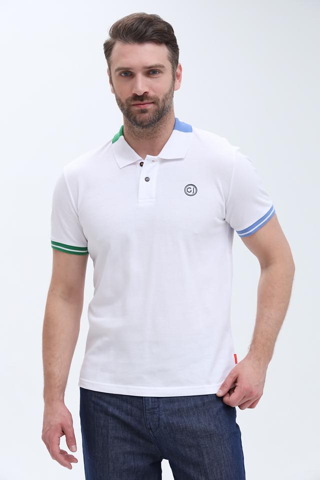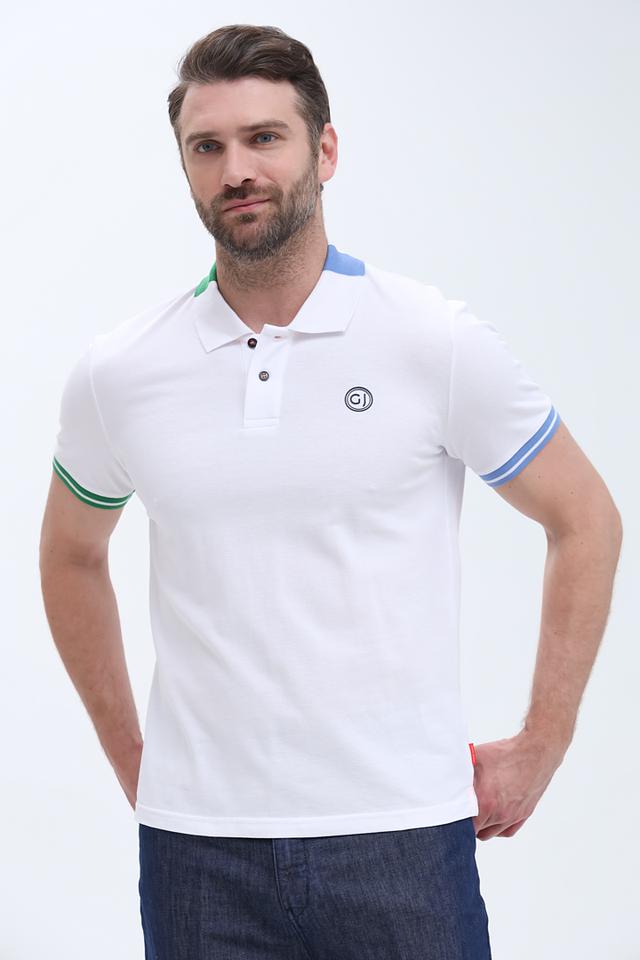 Мужское поло от бренда Gaudi выполнено в белом цвете с контрастной отделкой на воротнике и манжетах рукавов. Воротник выполнен из трикотажа с добавлением синего, красного и зеленого цветов, что придает модели оригинальный вид.