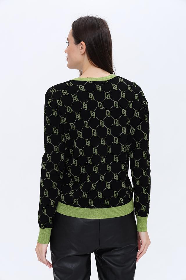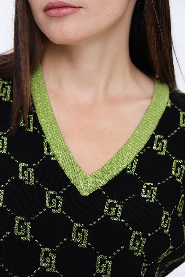 Женский джемпер Gaudi зеленого цвета с V-образным вырезом и геометрическим узором. Изготовлен из мягкой вискозы с добавлением полиэстера и эластана для комфорта и хорошей посадки. Состав: вискоза 53%, полиэстер 31%, эластан 16%