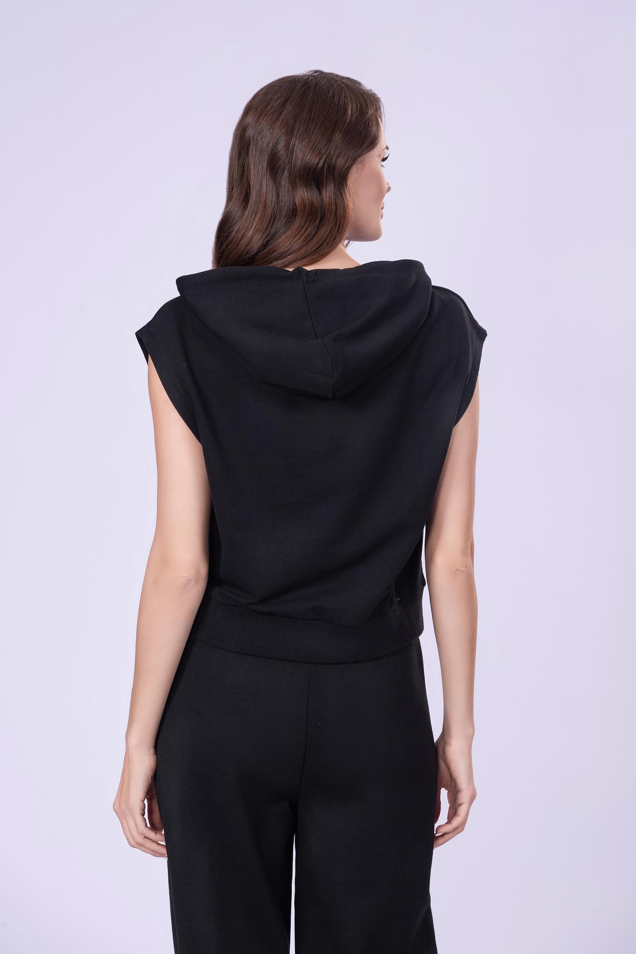 - Дизайн: Укороченный крой и капюшон делают жилет ультрамодным. Декоративные шнурки с кристаллами и небольшой логотип бренда добавляют изысканности.