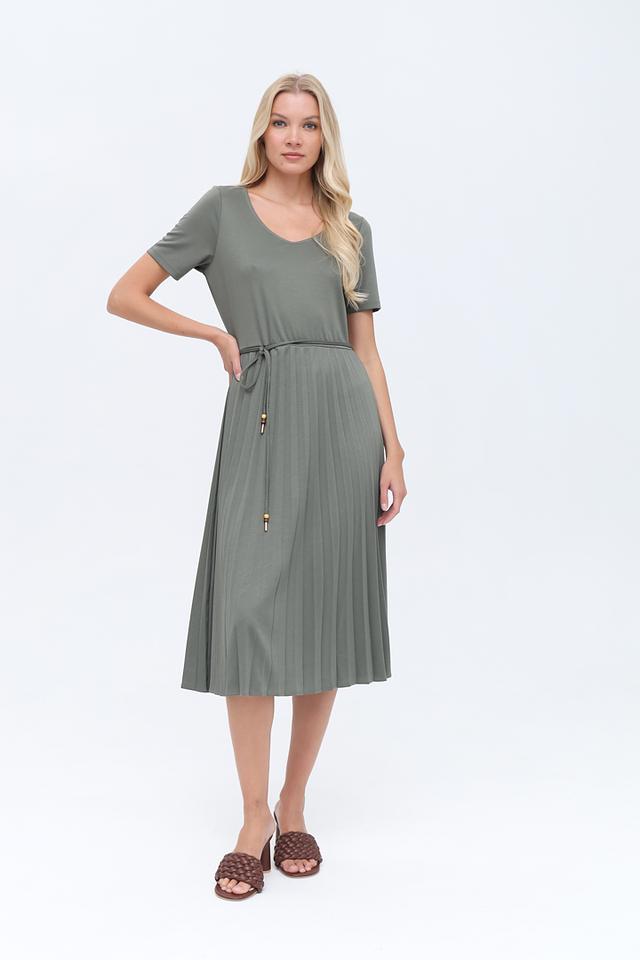 Модель имеет V-образный вырез, короткие рукава и приталенный силуэт. Особое внимание привлекает плиссированная юбка, которая придает платью легкость и женственность. Пояс-завязка позволяет подчеркнуть талию и создать более выразительный образ.