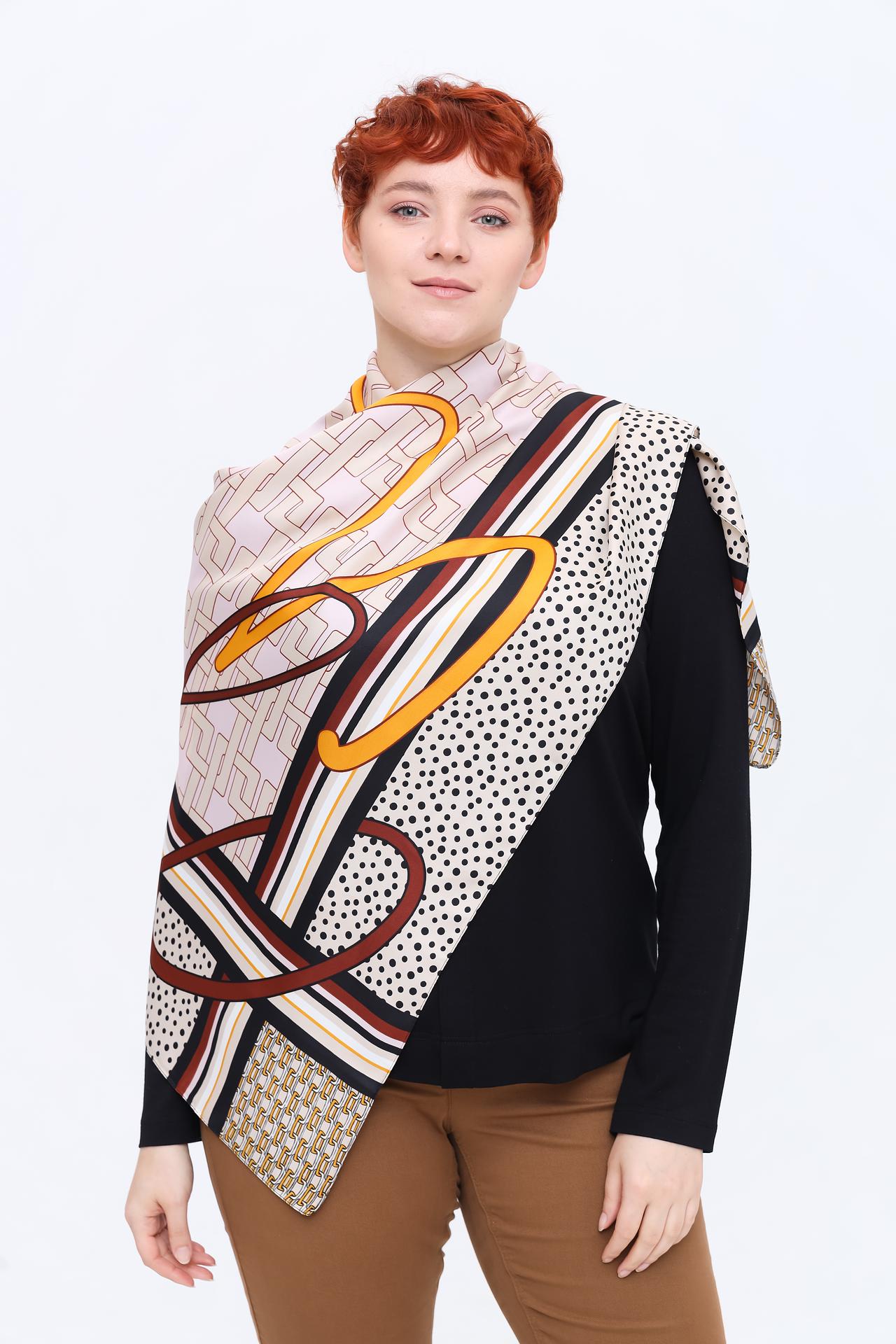 - Яркий акцент. Геометрический принт и интересное сочетание цветов делают этот платок заметным и привлекательным аксессуаром.