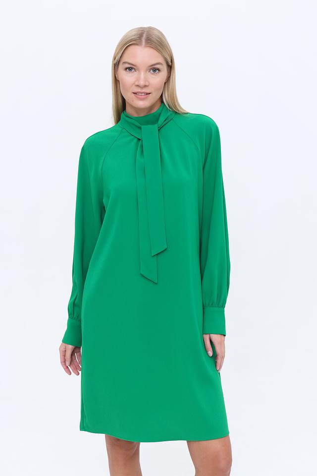 Модель имеет прямой силуэт, длинные рукава и высокий воротник с декоративной завязкой, создающей изящный акцент. Платье выполнено из 100% полиэстера, что обеспечивает комфорт в носке и простоту ухода.