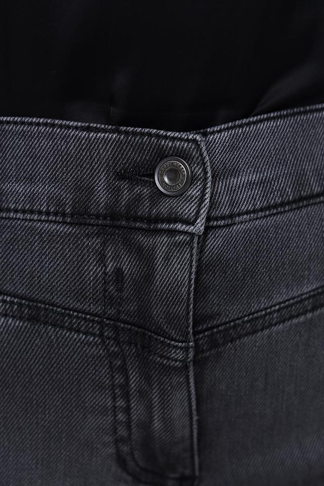 Джинсы имеют классический крой с зауженными к низу штанинами, что визуально удлиняет ноги и создает элегантный силуэт. Высокая посадка обеспечивает комфортную посадку по фигуре и подчеркивает талию. Ткань состоит из 77% хлопка, 10% вискозы, 10% переработанного полиэстера и 3% эластана, что обеспечивает мягкость, воздухопроницаемость и небольшую эластичность.