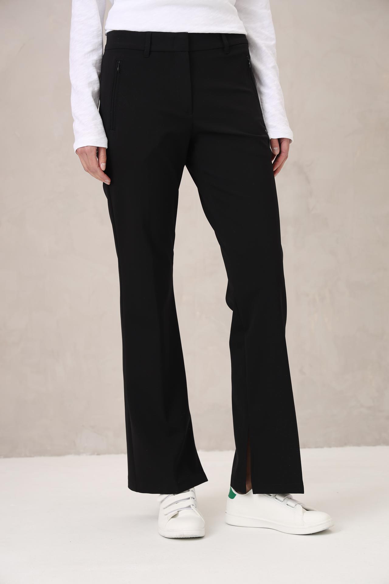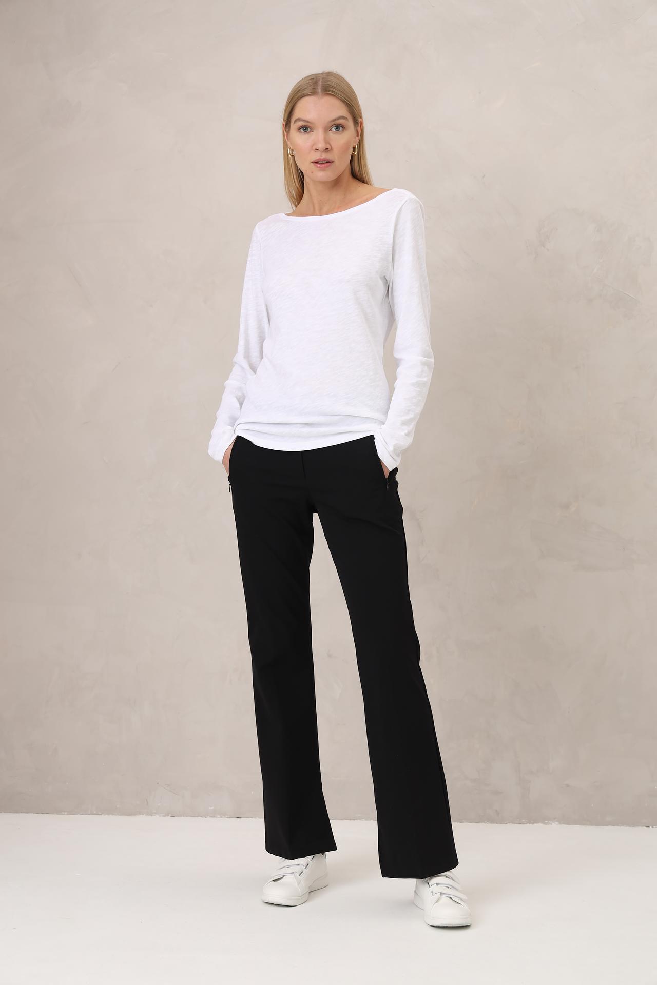 - Крой: Модель имеет прямой крой, который визуально удлиняет ноги и создает стройный силуэт. Актуальные разрезы по низу брючин добавляют изделию динамичности и позволяют легко комбинировать их с различной обувью.