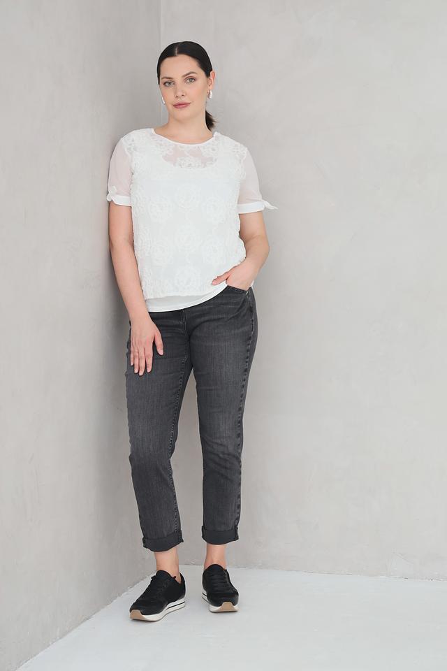 Серые джинсы Gerry Weber с эффектом потертостей и укороченным силуэтом – стильное и комфортное решение для повседневного образа. Модель выполнена из качественного хлопка с добавлением полиэстера и эластана. Состав: хлопок 84%, полиэстер 15%, эластан 1%