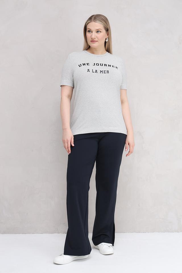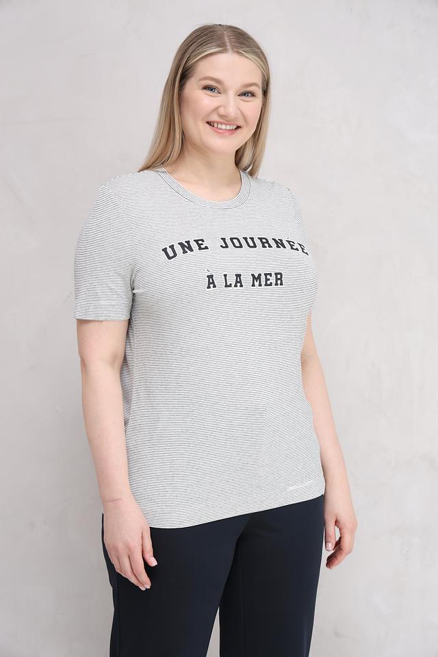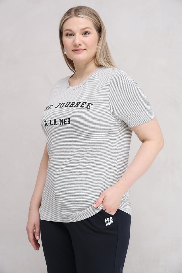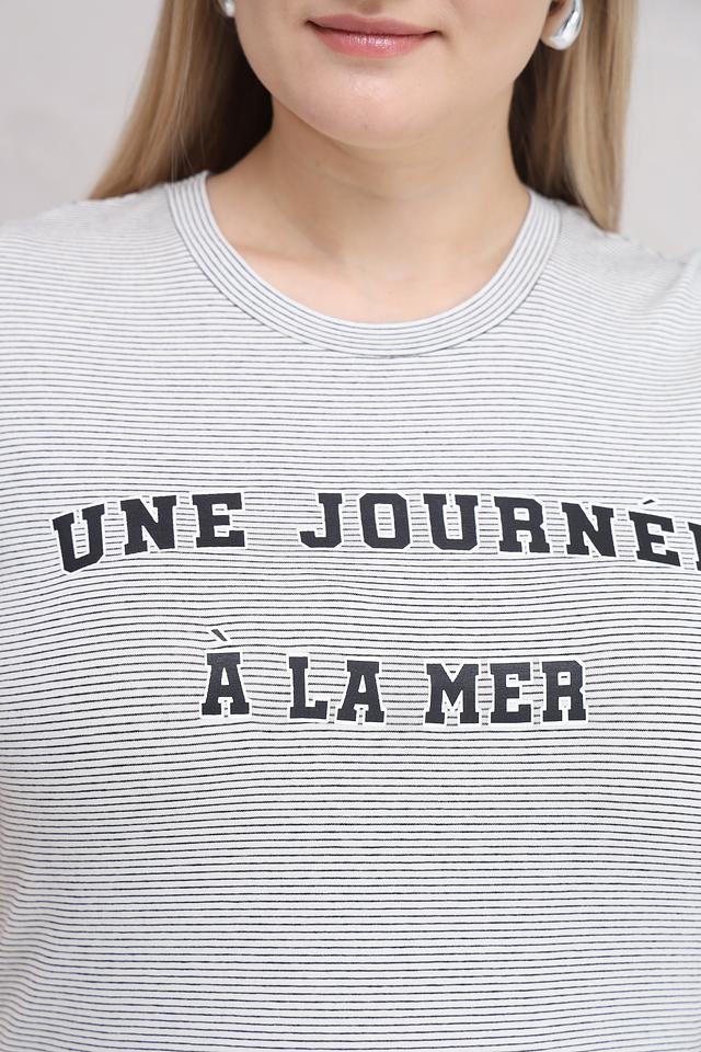 Футболка выполнена в сером цвете с тонкой полоской, что придает ей элегантный и универсальный вид. На передней части футболки расположен оригинальный принт с надписью "Une Journée à la Mer", добавляющий образу легкость и непринужденность.