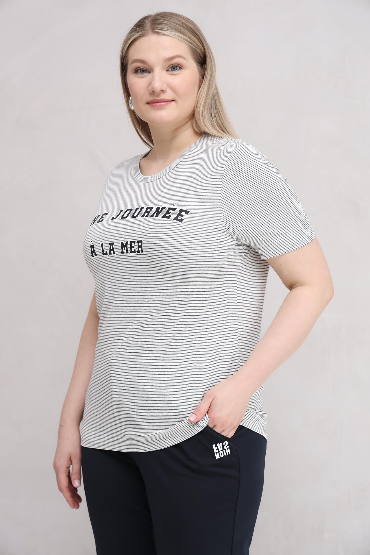 - Дизайн: Классический крой с коротким рукавом и круглым вырезом горловины. Футболка украшена деликатной полоской и контрастным принтом, который добавляет изюминку образу.