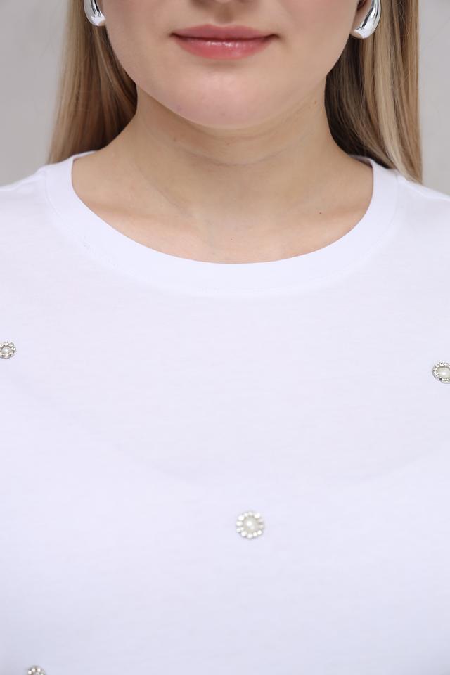 Особенностью данной модели является деликатная отделка из небольших камней, которые придают ей элегантный и изысканный вид. Футболка имеет классический прямой крой и круглый вырез горловины, что делает ее универсальной и подходящей для различных типов фигур.