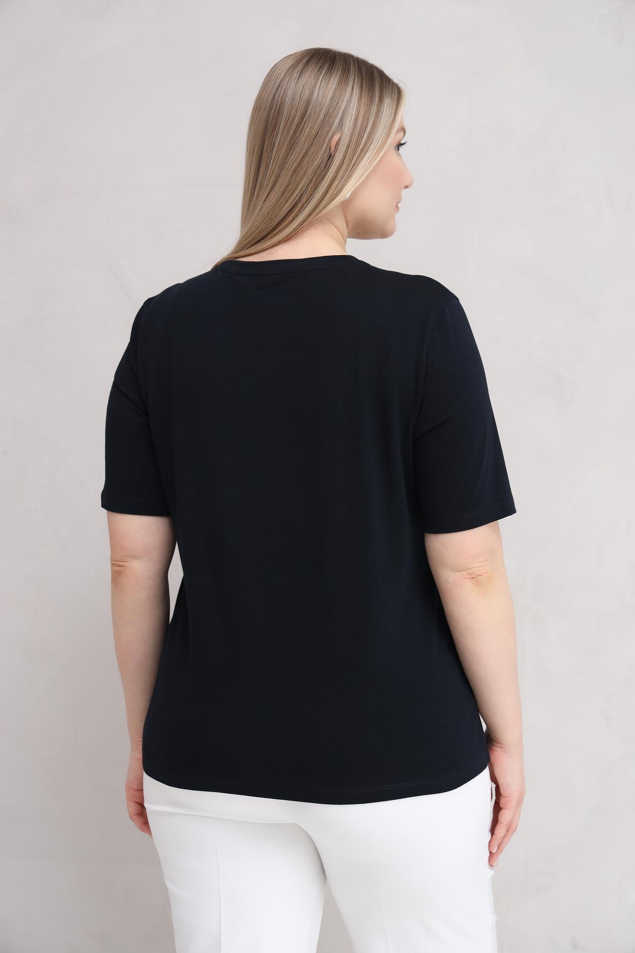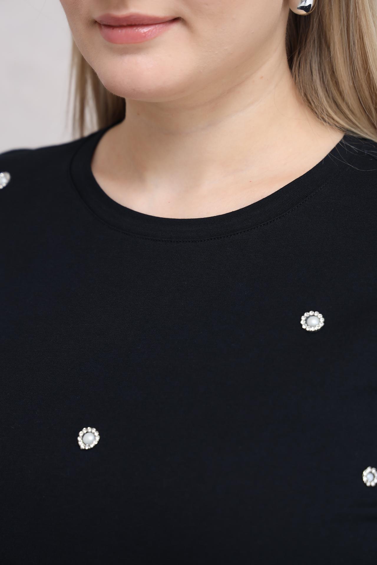 Оригинальности изделию добавляет деликатный декор в виде мелких страз, расположенных по всей поверхности. Это делает футболку не только удобной, но и стильной, подходящей как для повседневных, так и для более нарядных образов.