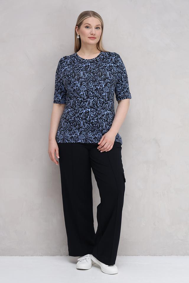 Футболка имеет прямой крой и короткий рукав. Главной особенностью модели является яркий и необычный геометрический принт, выполненный в сочетании синих и голубых оттенков на темном фоне. Круглый вырез горловины аккуратно оформлен.