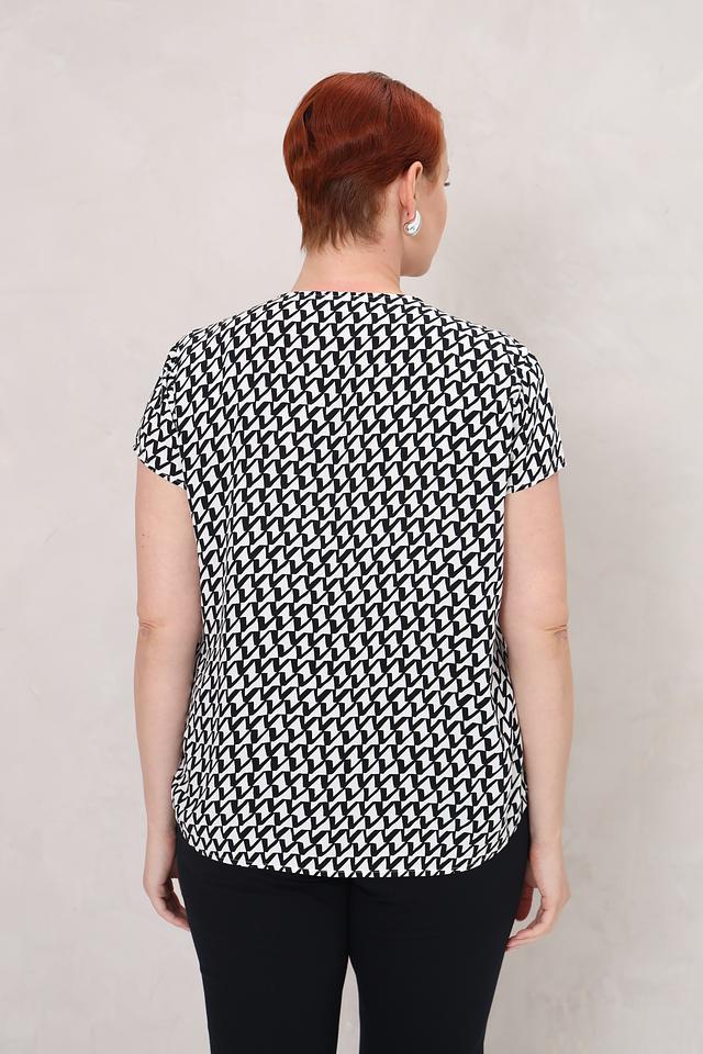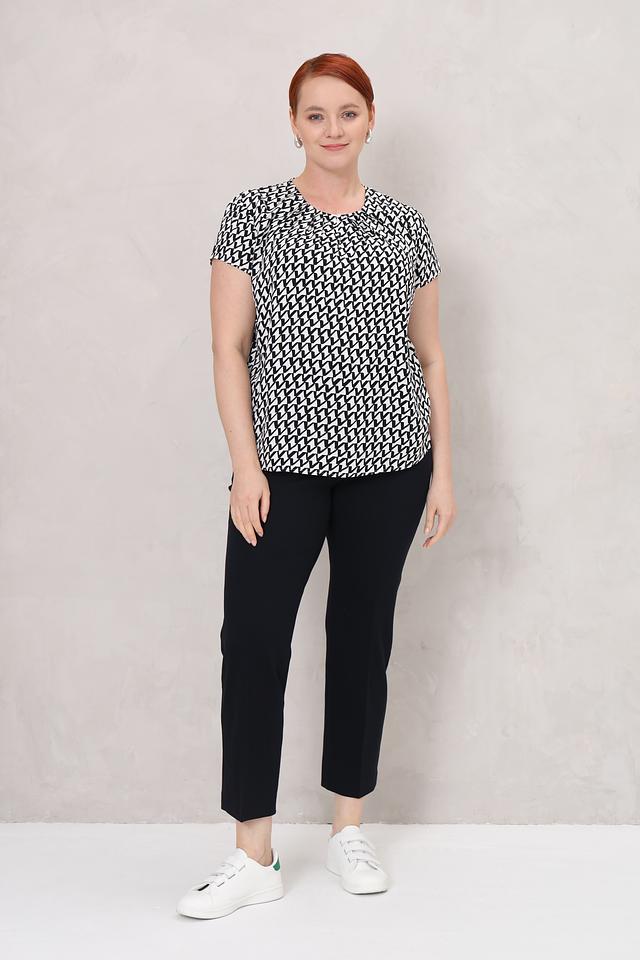 Основной цвет блузы – белый, но её украшает выразительный чёрно-белый геометрический принт, напоминающий клетку. Небольшая сборка на груди добавляет изящества и женственности силуэту.