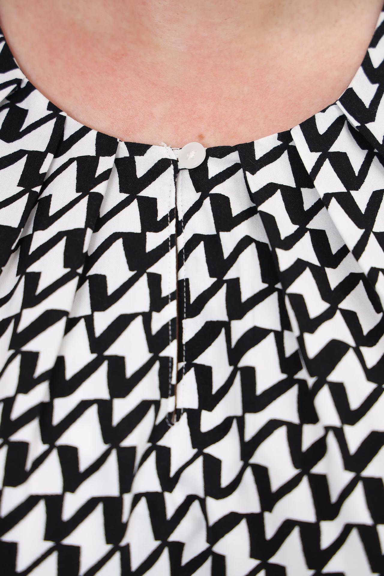 - Дизайн и узор: Отличительный чёрно-белый геометрический принт создаёт стильный и динамичный образ, легко сочетаясь как с однотонными брюками, так и с юбками.