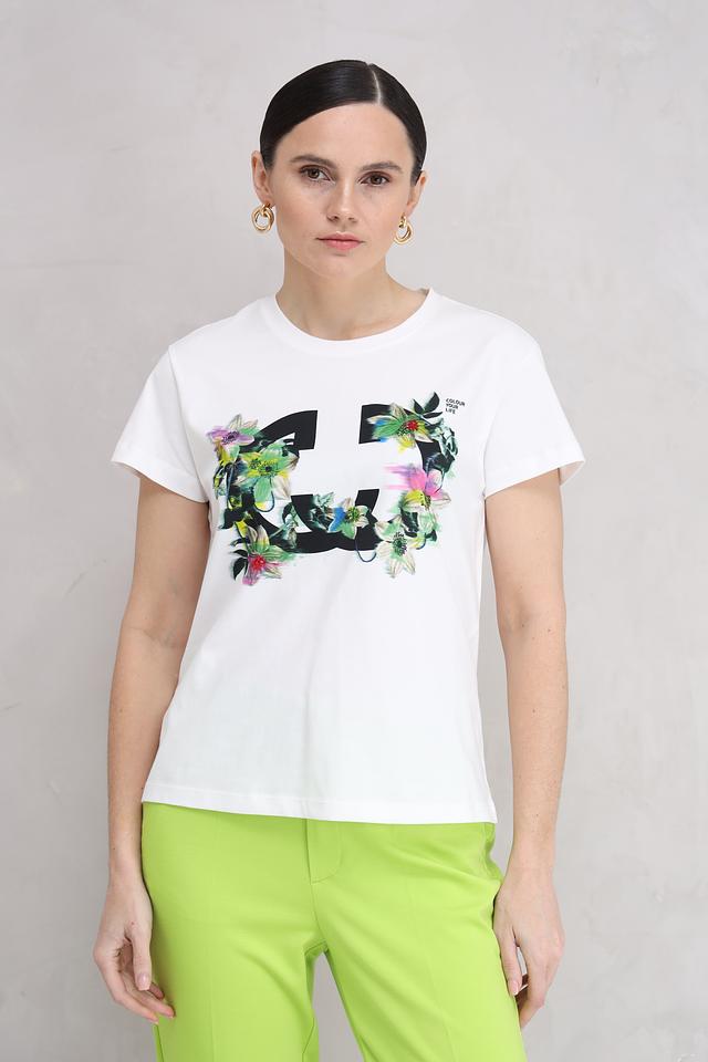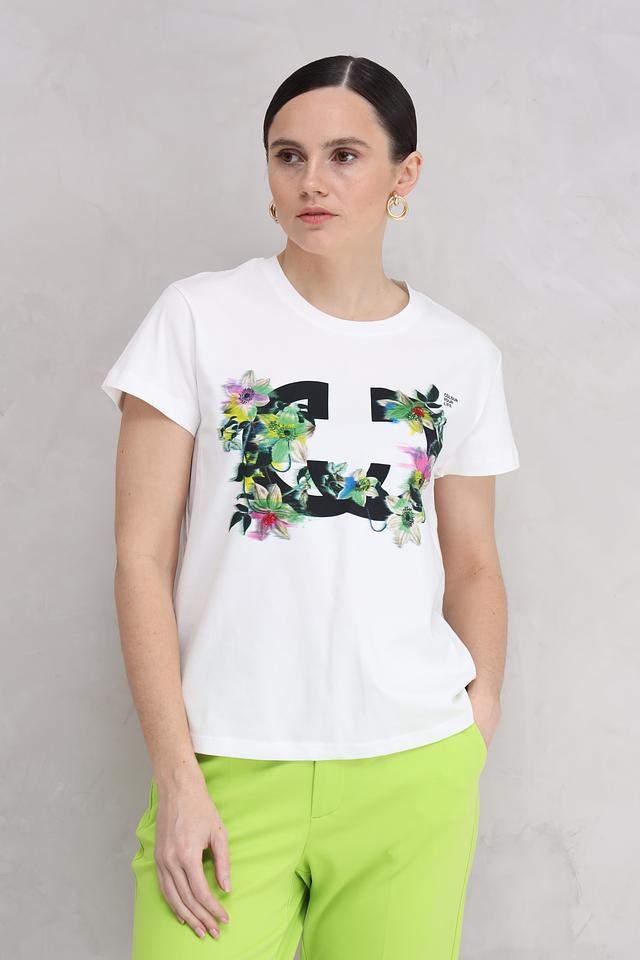 Белая футболка Gerry Weber с ярким цветочным принтом в виде лица. Изготовлена из 100% хлопка, обеспечивающего комфорт и воздухопроницаемость. Стильный и оригинальный дизайн сделает ваш образ неповторимым. Состав: хлопок 100%