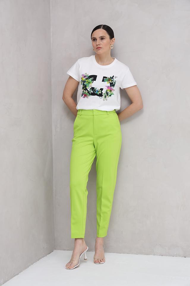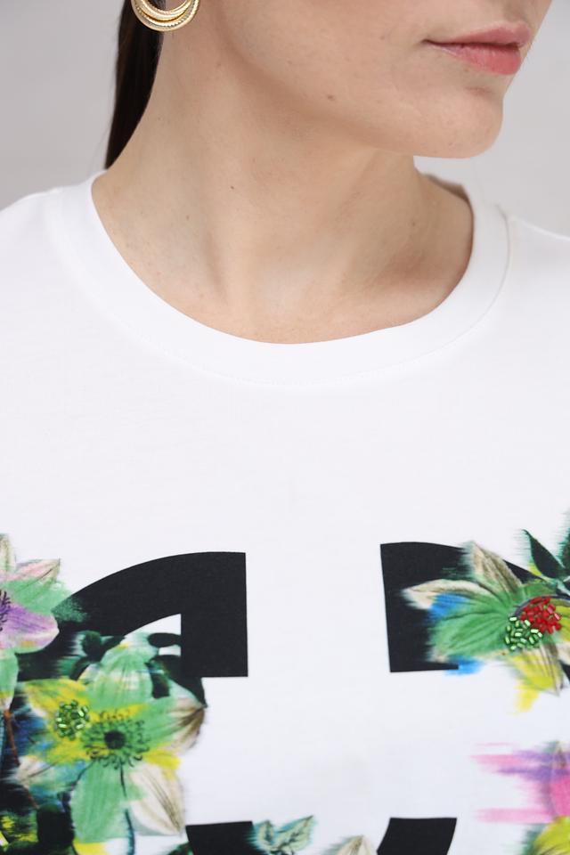 Особенностью данной модели является яркий и необычный цветочный принт, изображающий лицо. Принт выполнен в насыщенных зелёных, розовых и жёлтых тонах, что делает футболку яркой и запоминающейся.