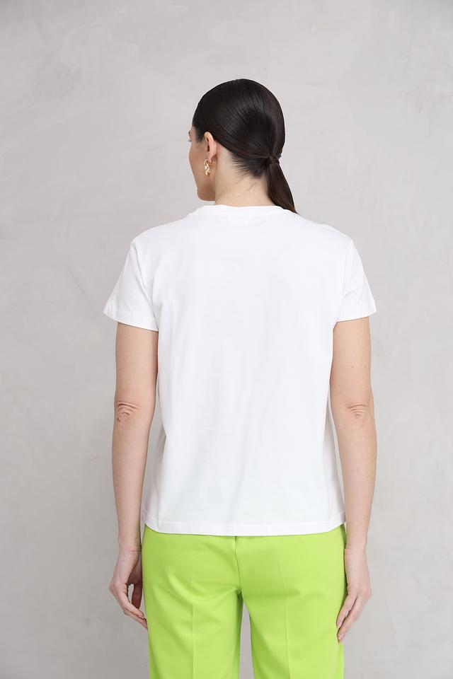 Круглый вырез горловины и короткие рукава обеспечивают свободу движений. Футболка имеет прямой крой, который подходит для любого типа фигуры. Эта футболка идеально сочетается с джинсами, брюками или юбками, создавая стильный и непринужденный образ.